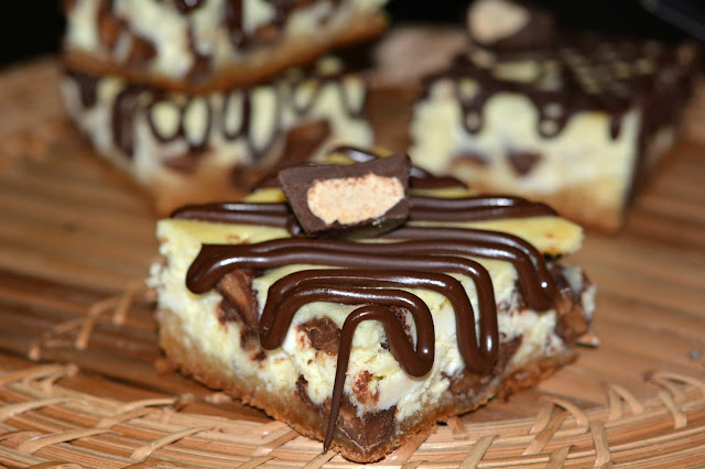Beat cream cheese until it is very smooth, about 3 minutes. Add in granulated sugar until the mixture is combined. Add eggs, one a time and continue beating. Add sour cream and vanilla extract until fully combined. Fold the cut pb cups into mixture and spread evenly into pan.