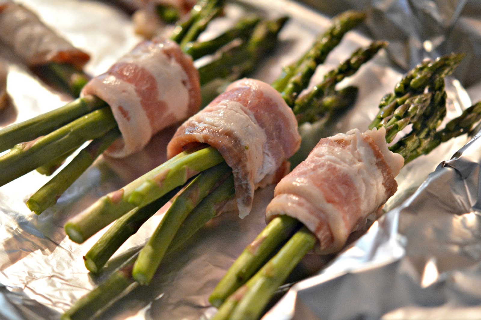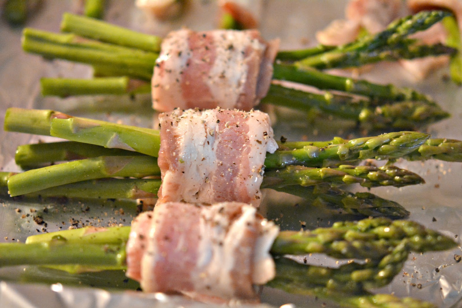 Line a pan with nonstick foil and preheat oven to 425. Toss asparagus with a drop of oil and season with salt/pepper. You have two choices. Either make bundles of 4-5 spears and wrap the bundle with half a slice of bacon laying it seam side down on the pan. OR…..individually wrap each spear with a half slice of bacon. (Add pepper to the bacon.) I did a combo of both ways and cooked some extra asparagus on the pan without bacon the same way. Roast for 10 minutes and flip over to brown the bacon for an additional 10 minutes!