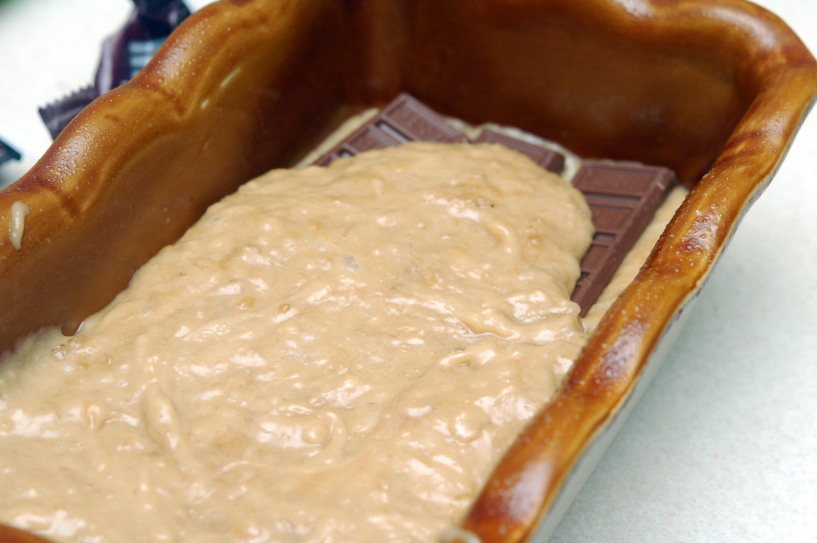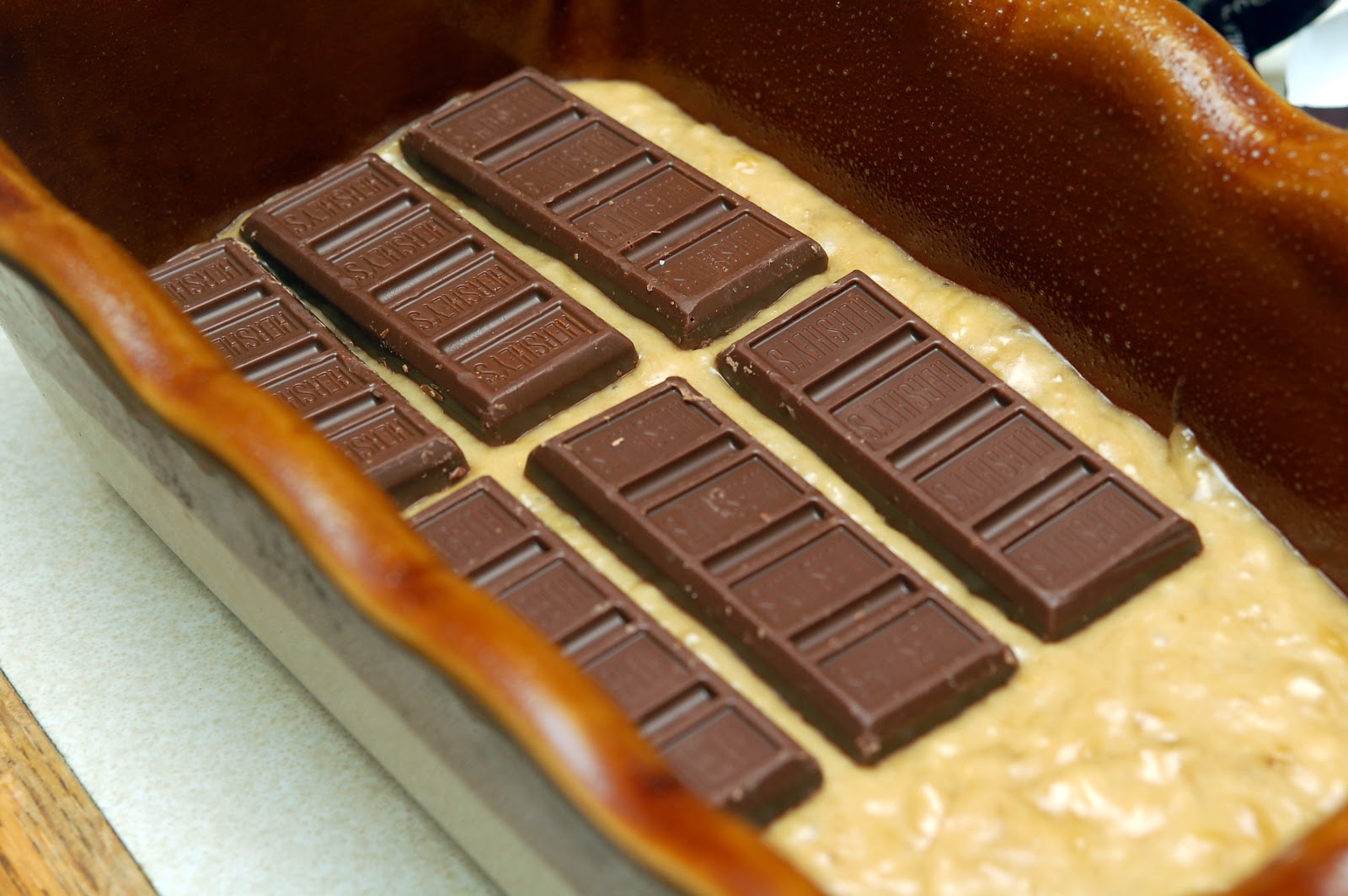 ONCE COMBINED, POUR HALF INTO A GREASED 9X5 PAN. ADD A LAYER OF SNACK SIZE HERSHEY BARS AND TOP WITH REST OF BATTER. BAKE AT 350 FOR 55-60 MINS.