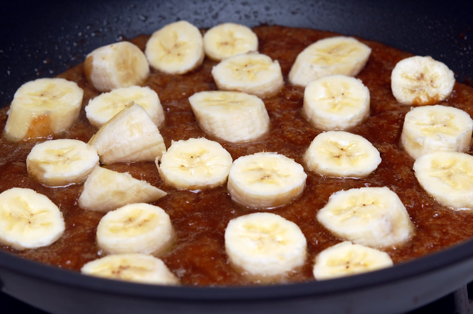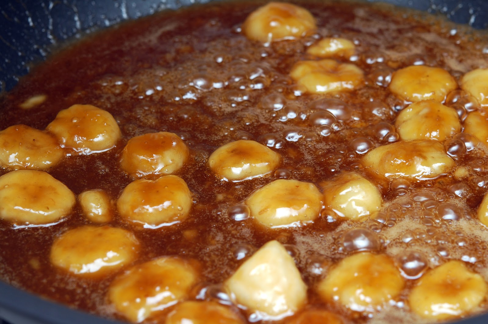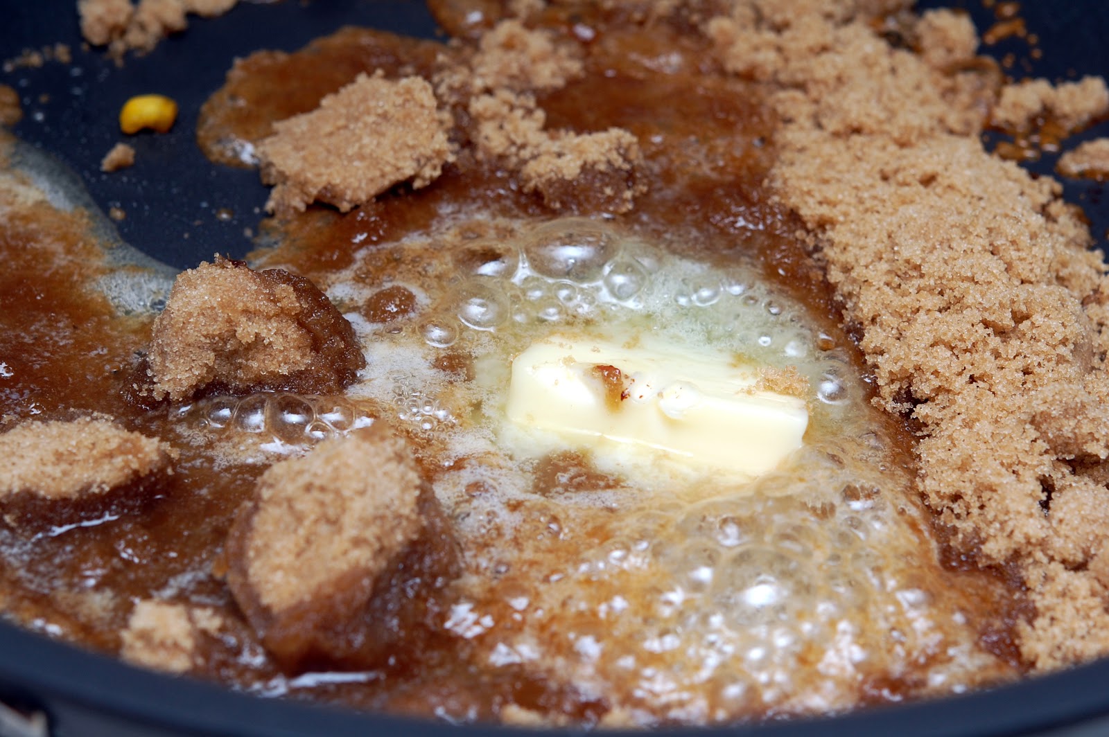 MELT 3 TABLESPOONS BUTTER IN A PAN AND ADD 3/4C. BROWN SUGAR. STIR UNTIL SUGAR IS MELTED AND BUBBLING.
