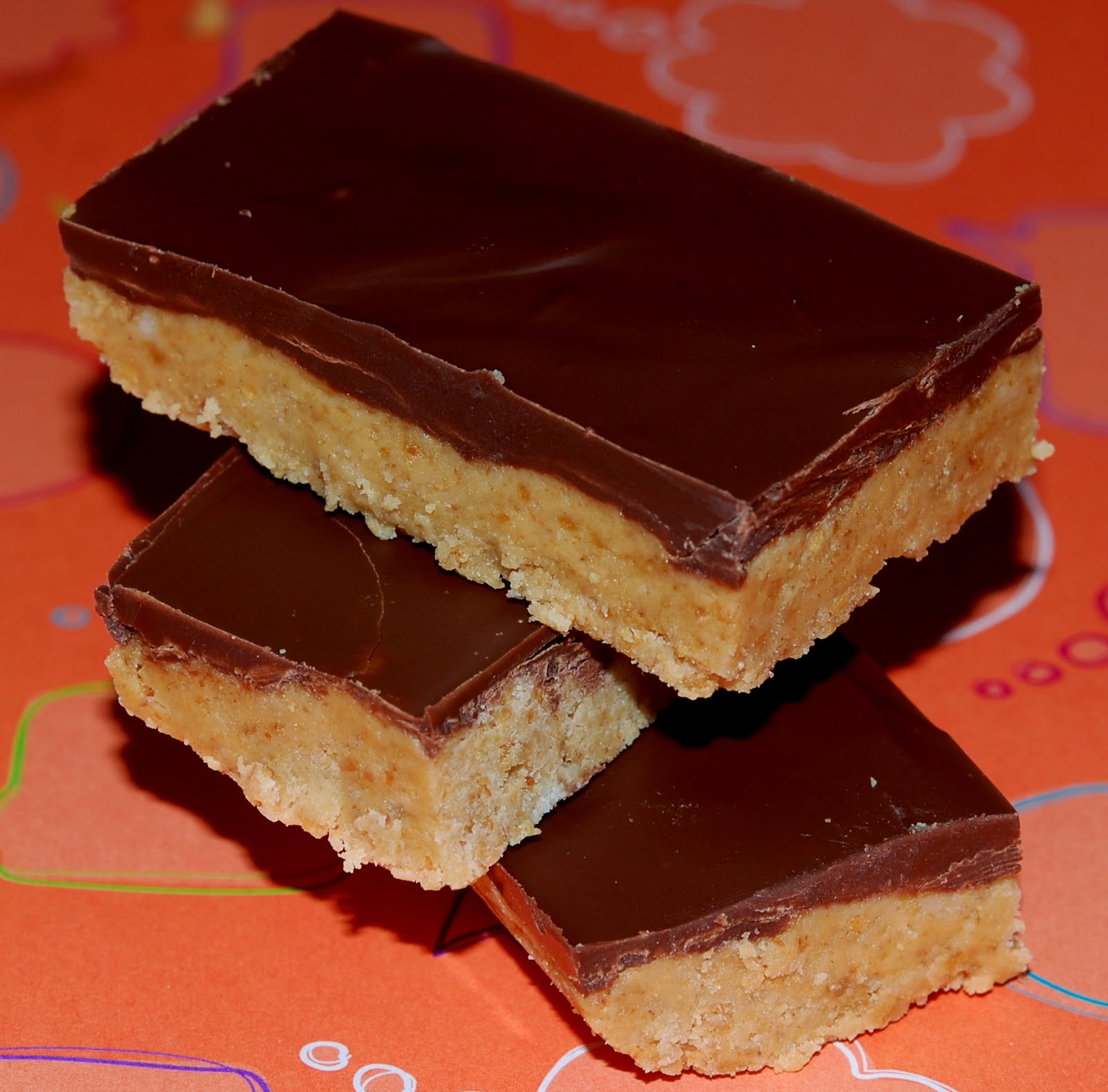 Melt chocolate chips and oil together in microwave, stirring every 30 seconds or so, till smooth. Spread over top of peanut butter layer.