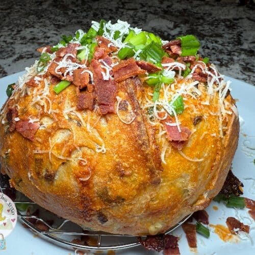 - Prepare more bacon, scallions and parmesan cheese to freshly grate on top!