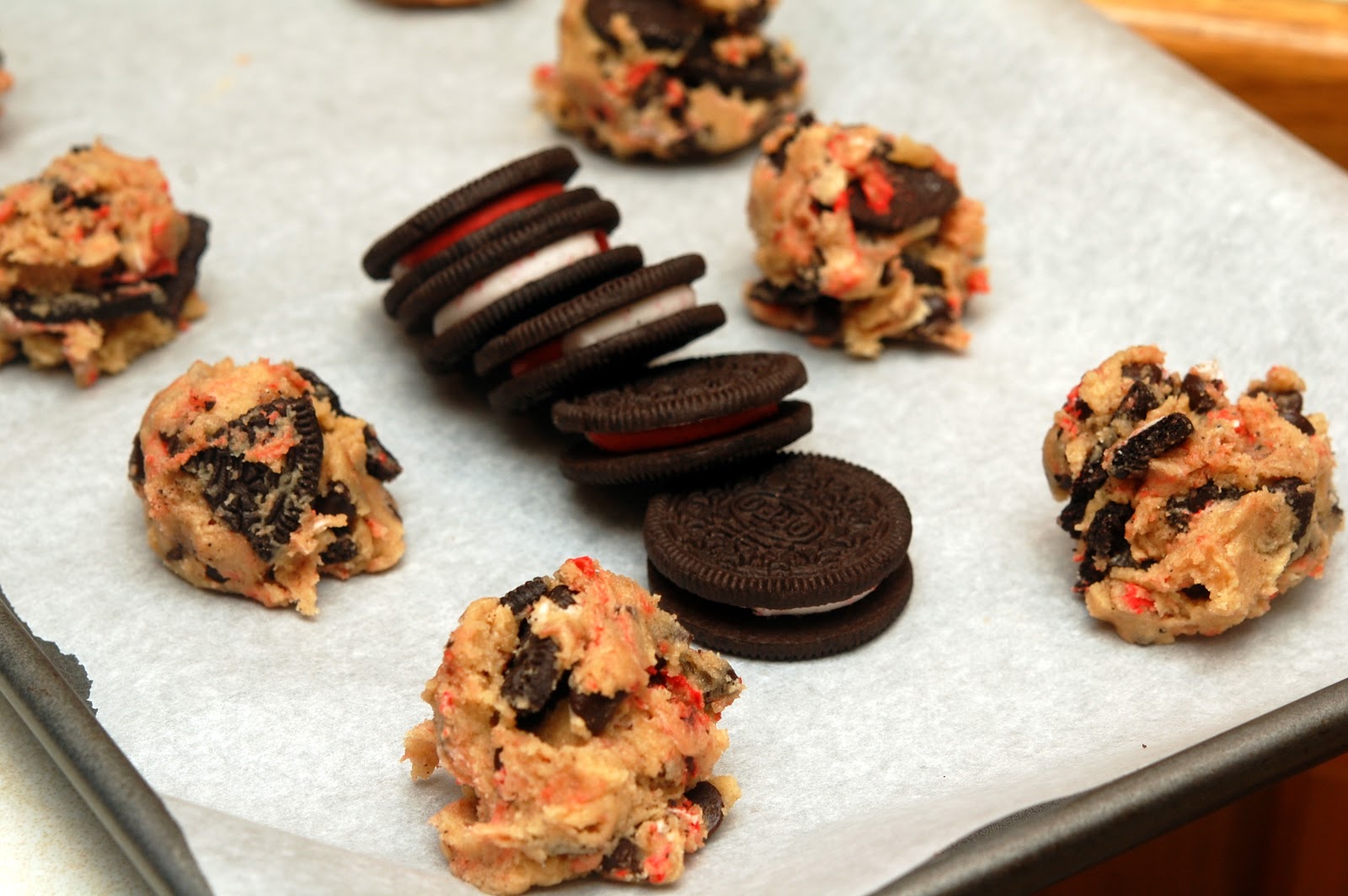 Beat butter and sugars until thoroughly combined. Add egg, yolk, and vanilla until combined. Add dry ingredients and beat at low-speed just until combined. Stir in chocolate chips. Stir in half the oreos. Reserve rest for the tops! Chill dough.