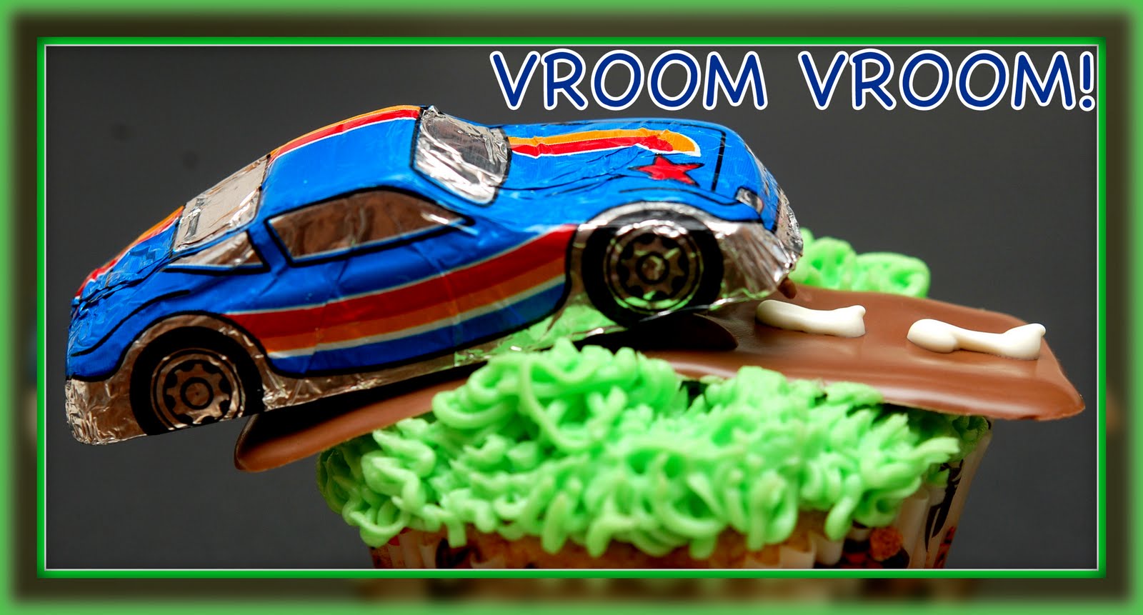 FROST CUPCAKES USING GREEN FOR THE GRASS AND LAY ROAD ON TOP. ATTACHED CARS GENTLY WITH MELTED CHOCOLATE AS THE “GLUE”-ENJOY!