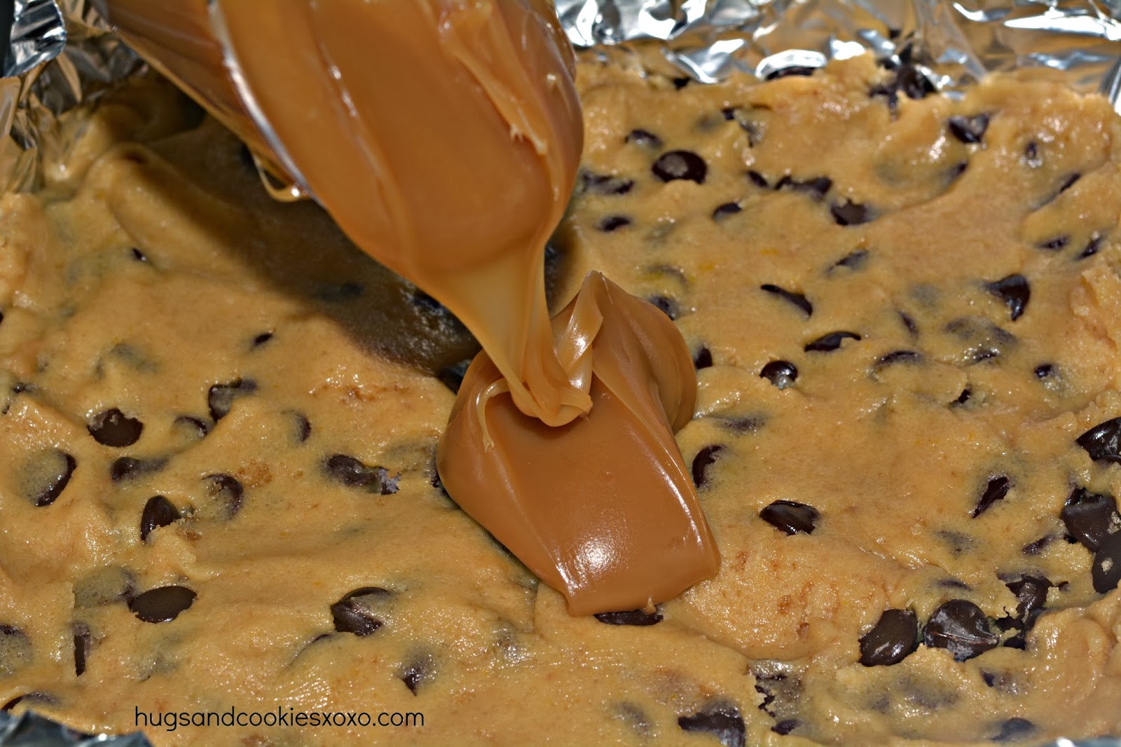 - Pat half the batter evenly in bottom of pan. Pour the caramel sauce over the cookie dough, leaving just a little space around the edges. Dollop the remaining cookie dough over the caramel. Carefully pat dough with your fingertips to distribute.The caramel will not be totally covered.