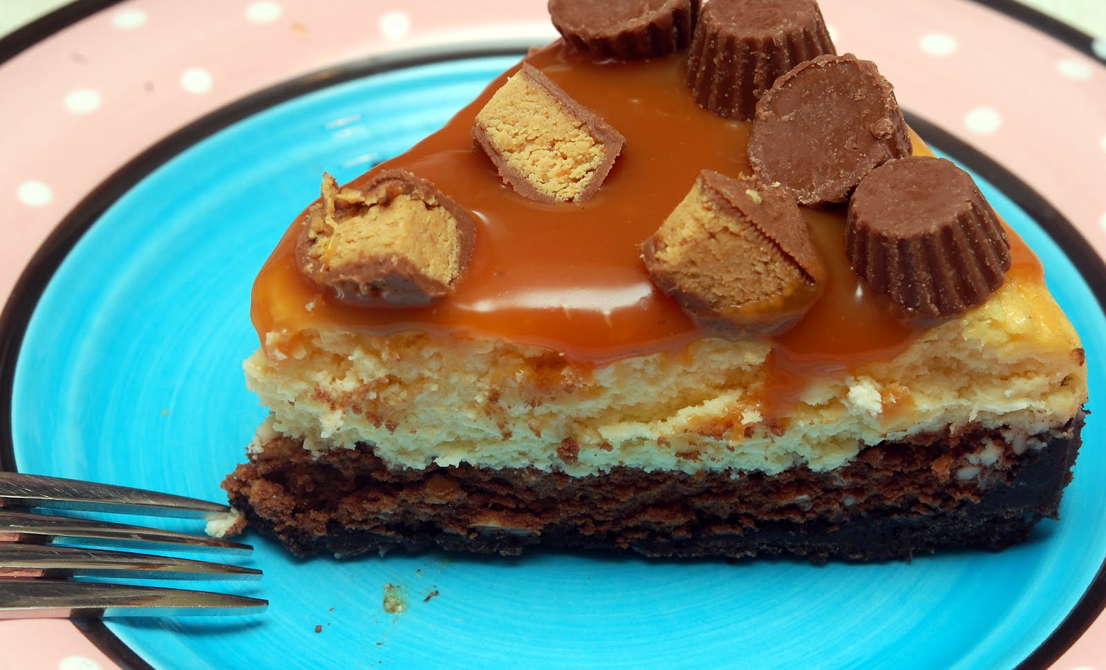BAKE AT 325 FOR 1 HOUR AND 15 MINS. COOL COMPLETELY AND REFRIGERATE. PREPARE CARAMEL-(CLICK HERE FOR RECIPE) TO POUR ON TOP AND GARNISH WITH PEANUT BUTTER CUPS!!! KEEP COLD!!!