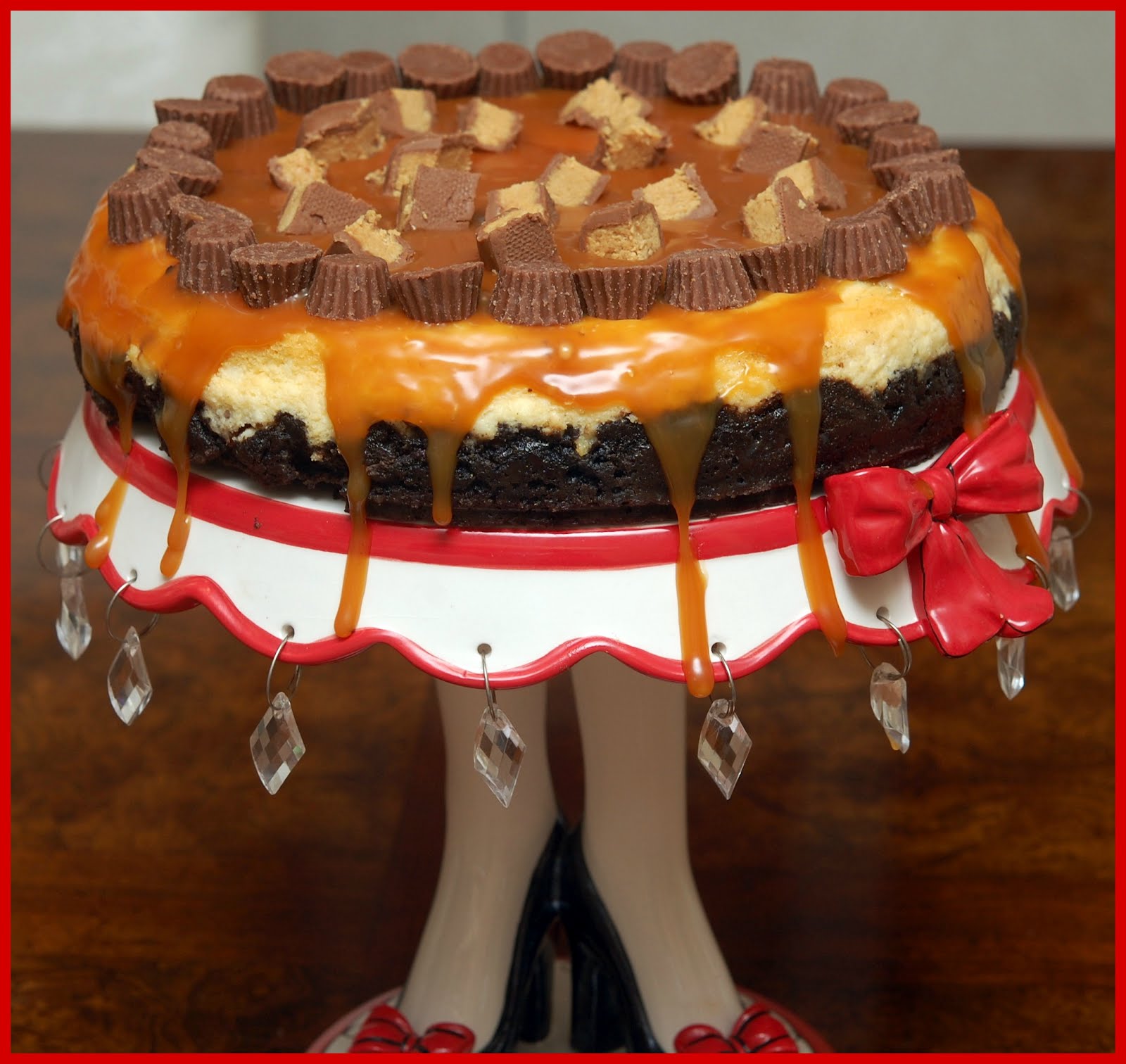 wow – this looks good! I think all that caramel sauce is a winner – dripping like that! Really makes me want something caramel! I love that cake stand!