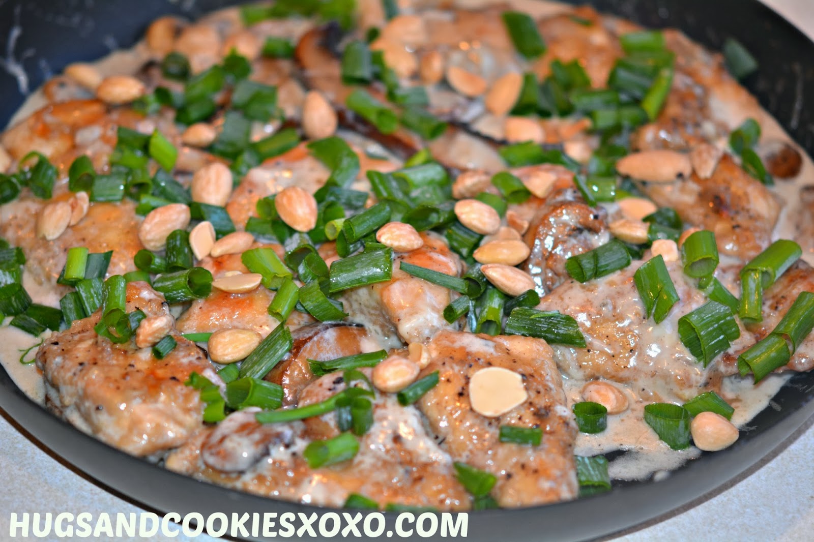 Remove the chicken again from the pan. Add the cream and cheese and heat them through, stirring to melt cheese. Once all combined and reduced a bit, add the chicken to the pan for a minute or two. Sprinkle almonds on top! Serve over brown rice or pasta.