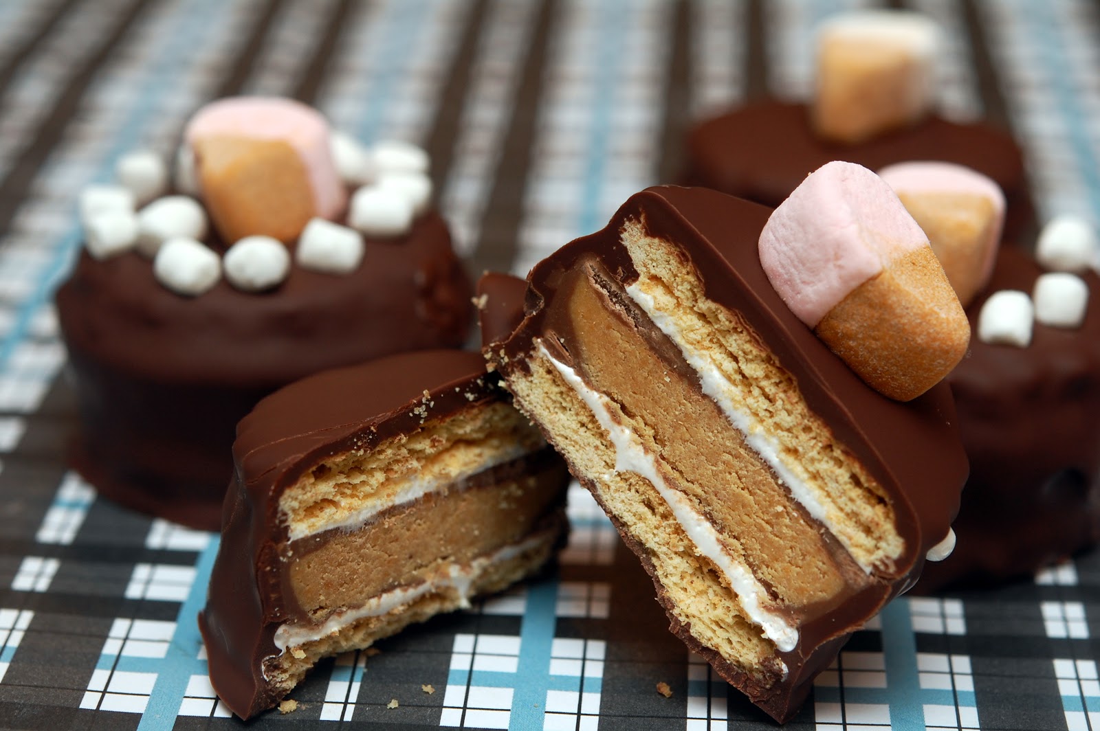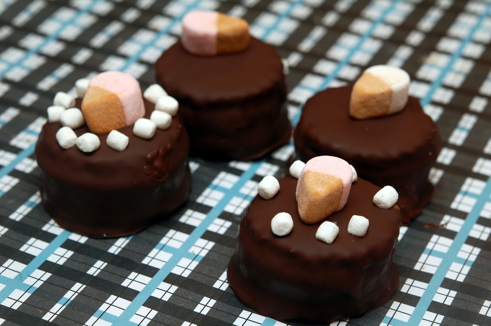 USE FLUFF TO STICK THE PB CUP TO THE COOKIES. CHILL AND DIP THE ENTIRE TREAT INTO MELTED CHOCOLATE. ADD TOPPINGS FOR DECORATION! I USED THOSE CUTE ICE CREAM CONE SHAPED MARSHMALLOWS!!!