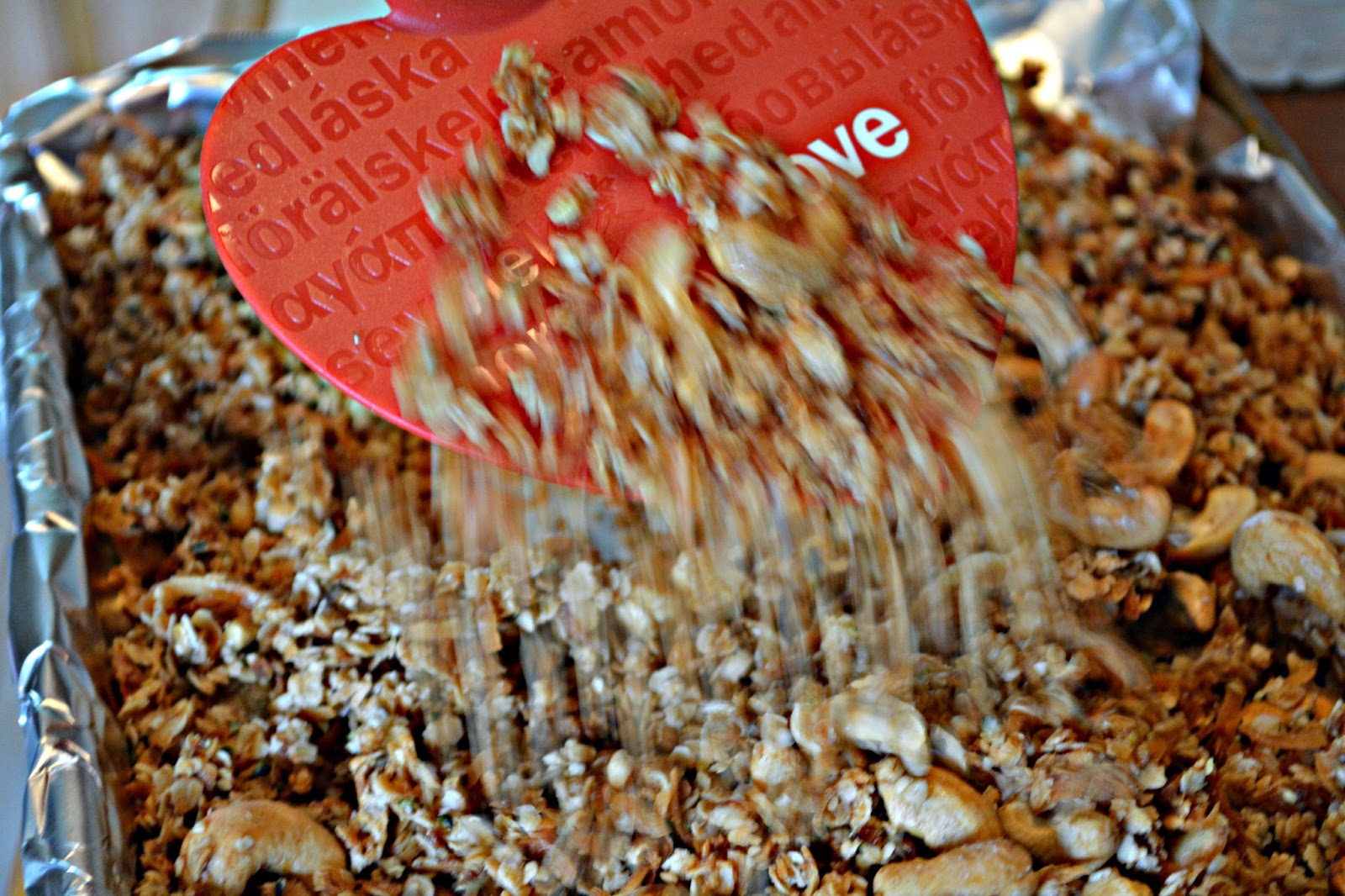 3. Pat the granola onto a nonstick sheet pan so it looks like one huge cookies keeping it even in thickness. Bake for 30-40 minutes or until granola is golden brown, stirring occasionally. Tip: If you like large, clumpy granola-do not stir. Let cool completely and break into large clumps.
