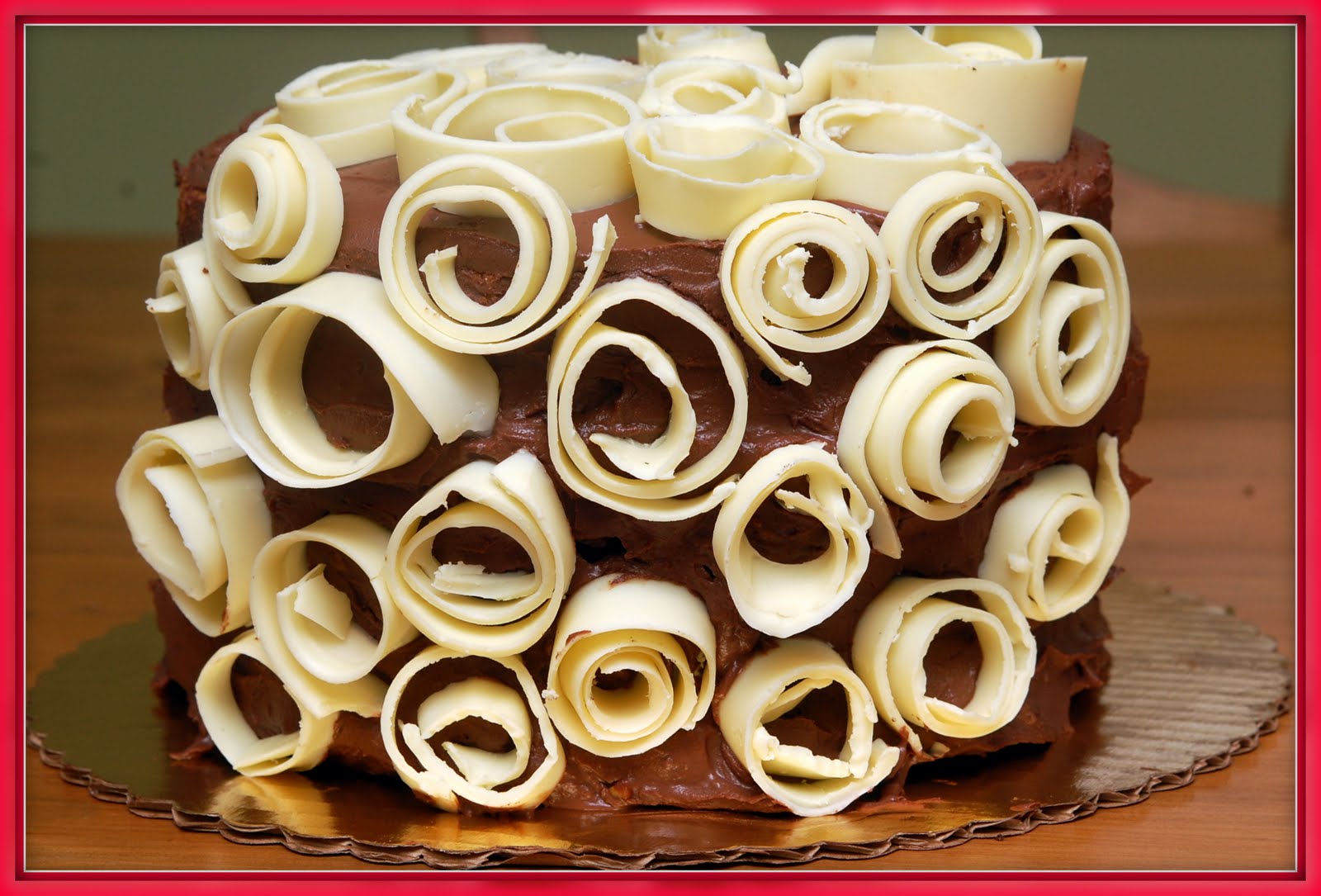 | HERE IS THE OUTSIDE OF THE CAKE. IT IS GARNISHED WITH HANDCRAFTED VALRHONA WHITE CHOCOLATE CURLS |