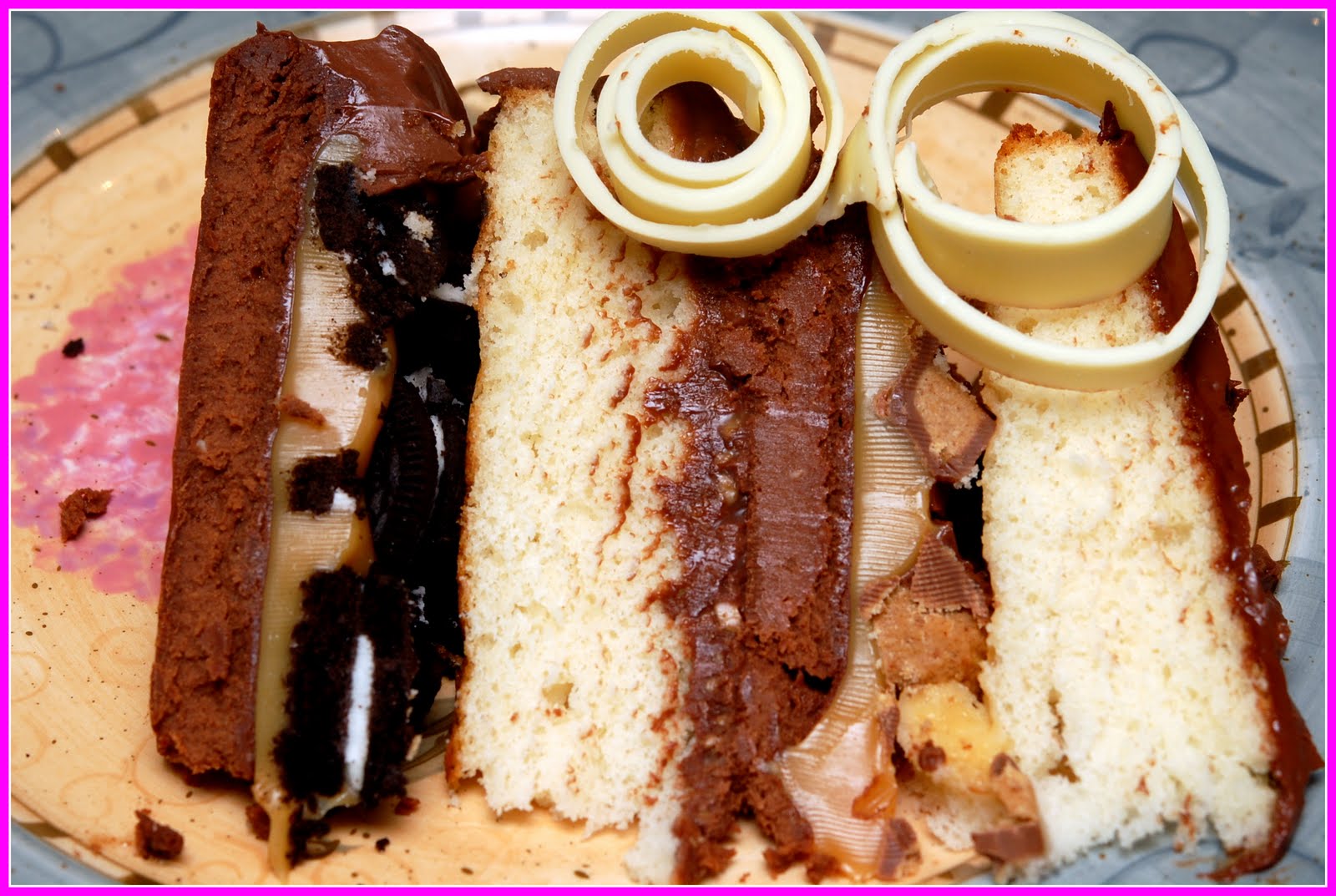 | THIS CAKE BEGAN WITH 2 LAYERS OF CHOCOLATE CHEESECAKE. EACH ONE WAS TOPPED WITH THICK CARAMEL AND GARNISHED WITH CHOPPED OREOS AND PEANUT BUTTER CUPS. ARE YOU SOLD YET? |