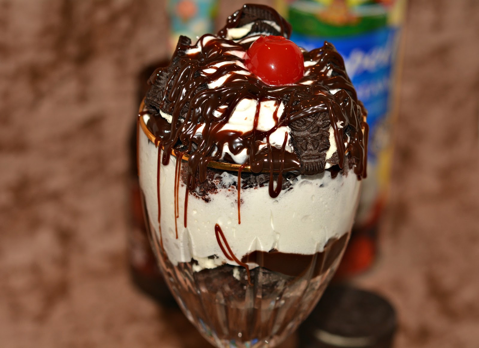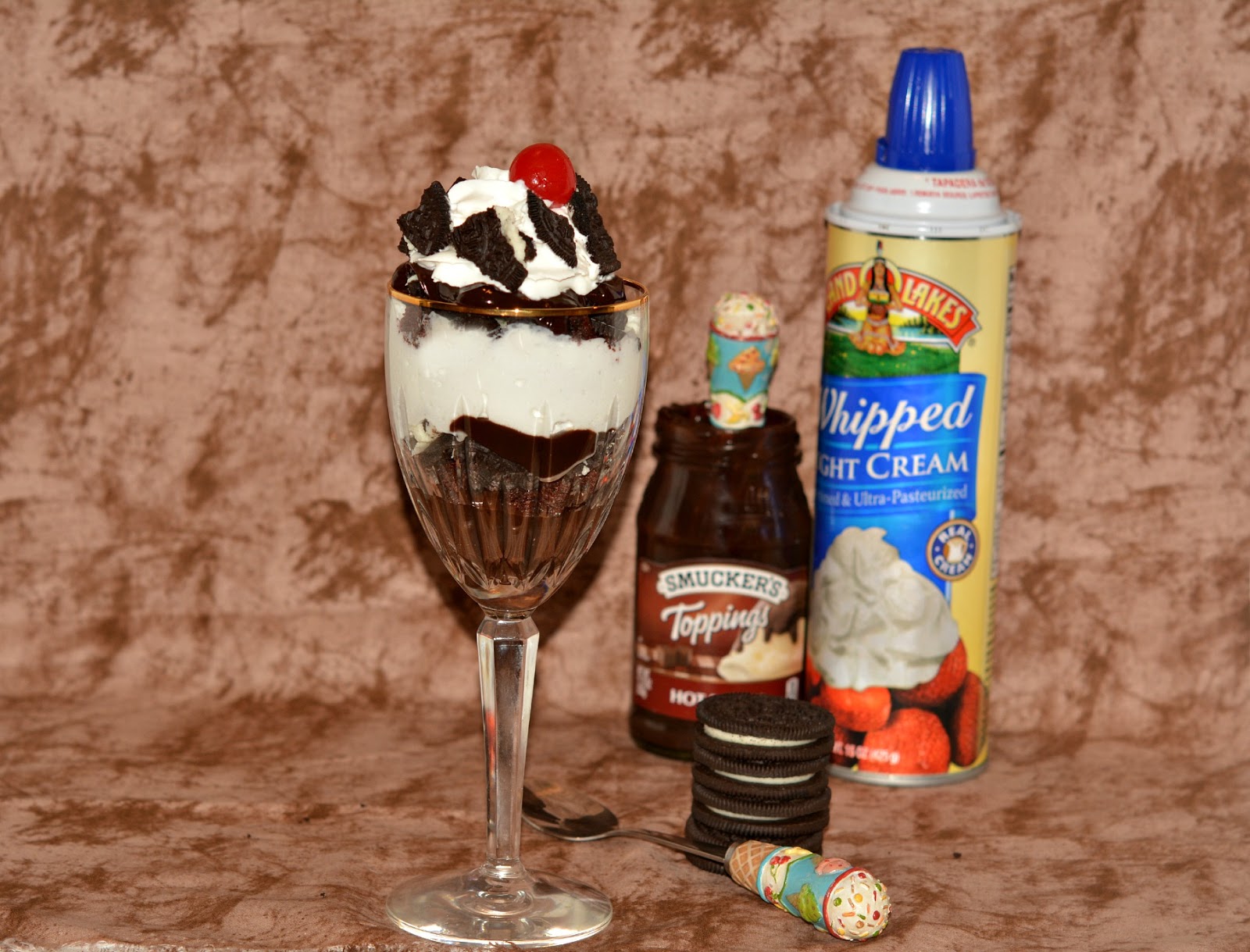 Cut the cake into small squares. Layer Cake, Hot Fudge Topping, Oreos and Whipped Cream. Just keep repeating these 4 decadent ingredients until you reach the top.