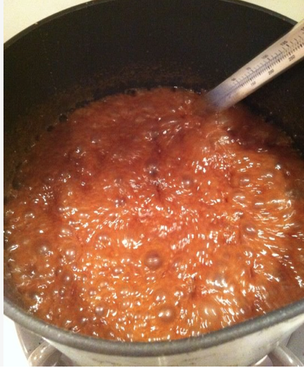START BY BOILING SOME HOT CARAMEL-TIP: DON’T BREAK CANDY THERMOMETER ON THE FLOOR LIKE I DID!