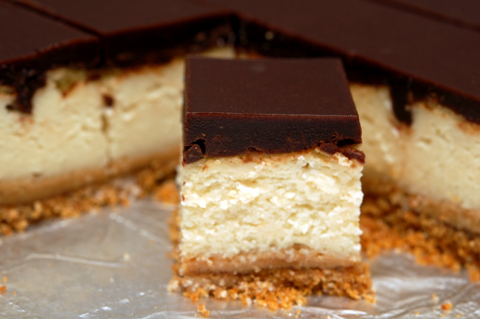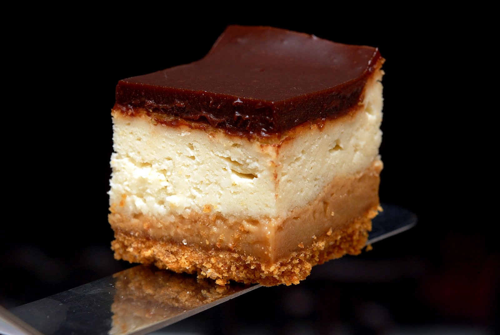 Microwave all until smooth. Pour over the cheesecake evenly and chill at least 30 mins. Cut into squares!