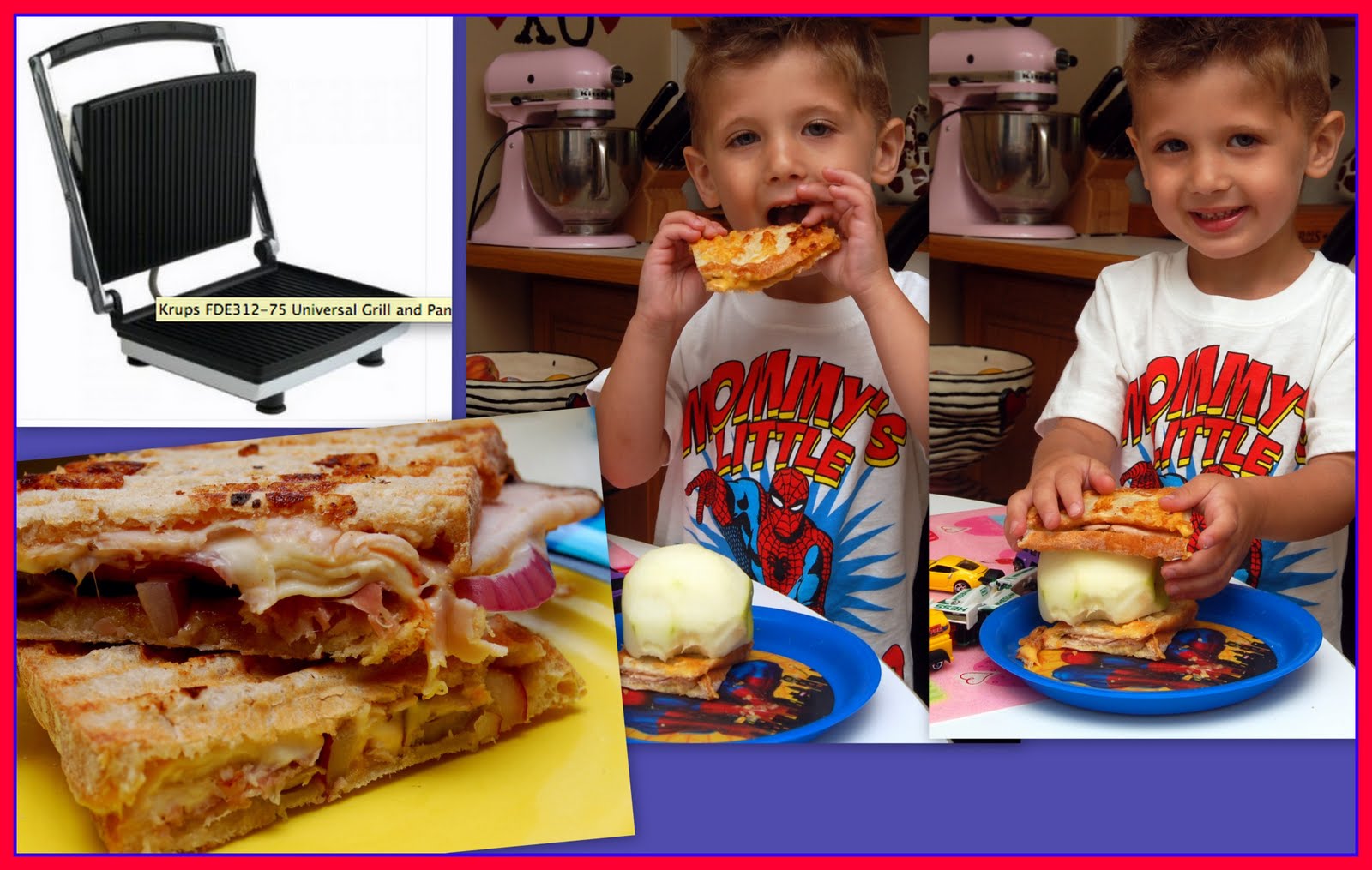 FOR A SPECIAL LUNCH WITH GRANDMA WE HAD “MAKE YOUR OWN PANINI” SANDWICHES! A PERFECT *FUN* LUNCH TO BEAT THE HEAT OF COOKING! WE OFFERED MAPLE TURKEY, PROSCIUTTO, MUENSTER & AMERICAN CHEESES, OLIVES, RED ONION, HONEY MUSTARD AND THINLY SLICED APPLES!! THEY WERE A HIT! JADEN, HOWEVER, PREFERRED HIS APPLE A TEENY BIT THICKER THAN WE DID….SEE PICTURE!! HEE HEE
