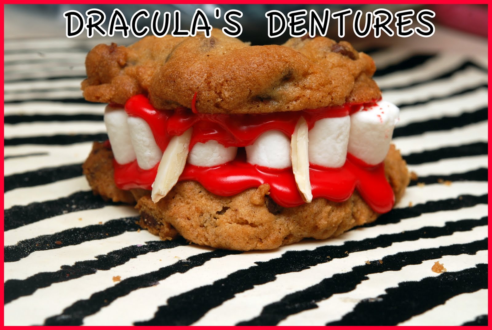 MAKE PILLSBURY COOKIES OR A HOMEMADE VERSION. ADD RED FOOD COLORING TO WHITE FROSTING AND MAKE IT VIBRANT. USE MINI MARSHMALLOWS FOR THE TEETH AND SLIVERED ALMONDS FOR THE FANGS AND ASSEMBLE.
