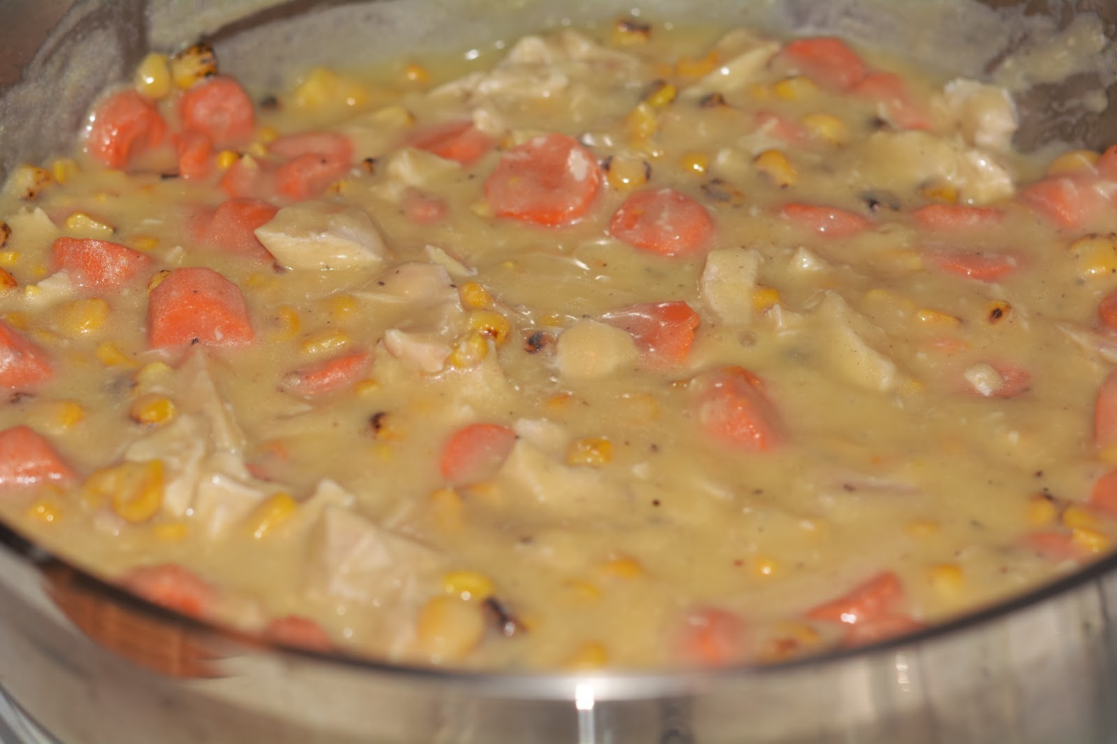 In a pot, melt 4 Tablespoons butter and sprinkle in 1/4 cup flour, stirring to combine very well. Cook 1 minute. Add 2 cups chicken broth and 2 Tablespoons heavy cream. Stir to combine and simmer on low to thicken a bit. Stir in the corn kernels, chicken, 1/2 can peas (optional), carrots and salt/pepper.