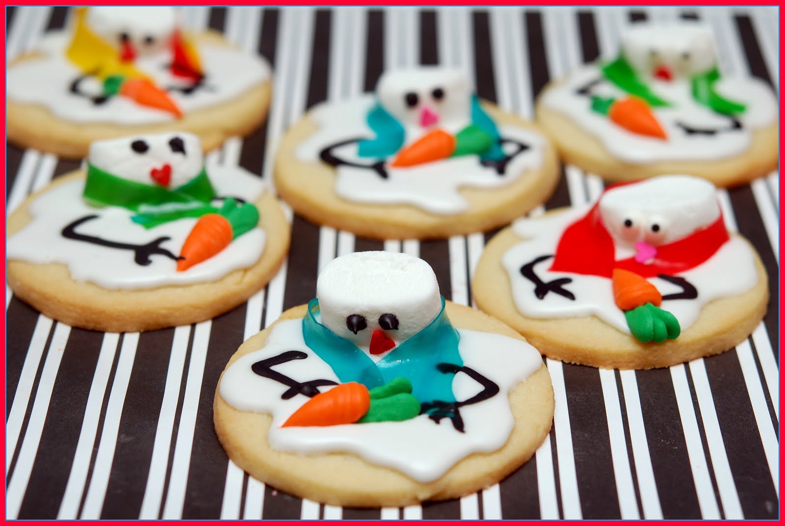BAKE PILLSBURY SUGAR COOKIES ACCORDING TO PACKAGE DIRECTIONS. FROST WITH ROYAL ICING OR CANNED ICING THAT WAS HEATED A BIT TO MAKE IT “MELTY.’ ADD HALF A MARSHMALLOW FOR THE HEAD. USE FRUIT ROLLUPS FOR THE SCARVES AND GEL FROSTING FOR THE ARMS AND EYES! A SPRINKLE MOUTH AND I BOUGHT CANDY CARROTS TO ATTACH!