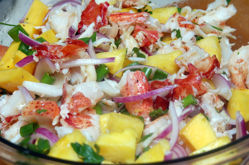 NOT AN EXACT RECIPE…..JUST CHOP SOME MANGO, RED ONIONS, SCALLIONS, PINEAPPLE AND A WHOLE LOT OF LOBSTER! DRIZZLED WITH OLIVE OIL, SALT & PEPPER! SERVE IMMEDIATELY OR THE ACID IN THE PINEAPPLE WILL RUIN YOUR LOBSTER!! LOL