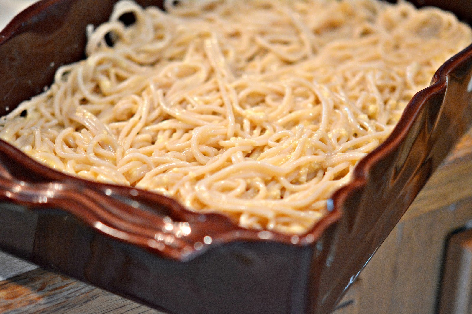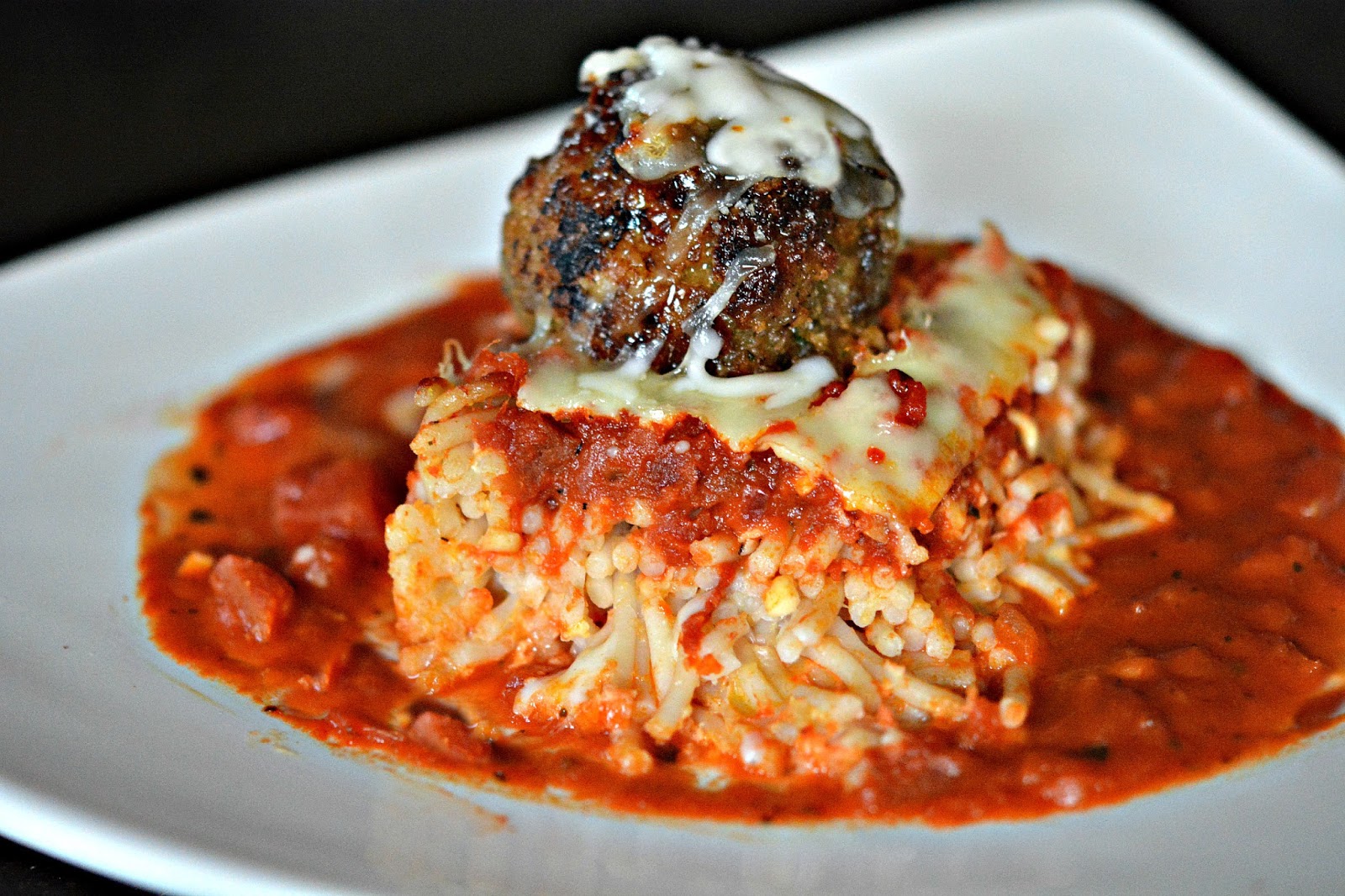 Preheat your oven to 375. Boil your pasta. Drain. Run under cold water and then mix it with the egg and grated Parmesan cheese. Lay it in the bottom of a greased 9×13 pan. Sprinkle a layer of mozzarella cheese on top. Pour the jar of sauce over the cheese. Place your meatballs on top of the sauce. Bake for 25-30 minutes. Remove and sprinkle more cheese on top. Bake an additional 10-15 minutes. Let sit 15 minutes and cut like a cake! Serve with extra sauce on the side or under each plated slice.