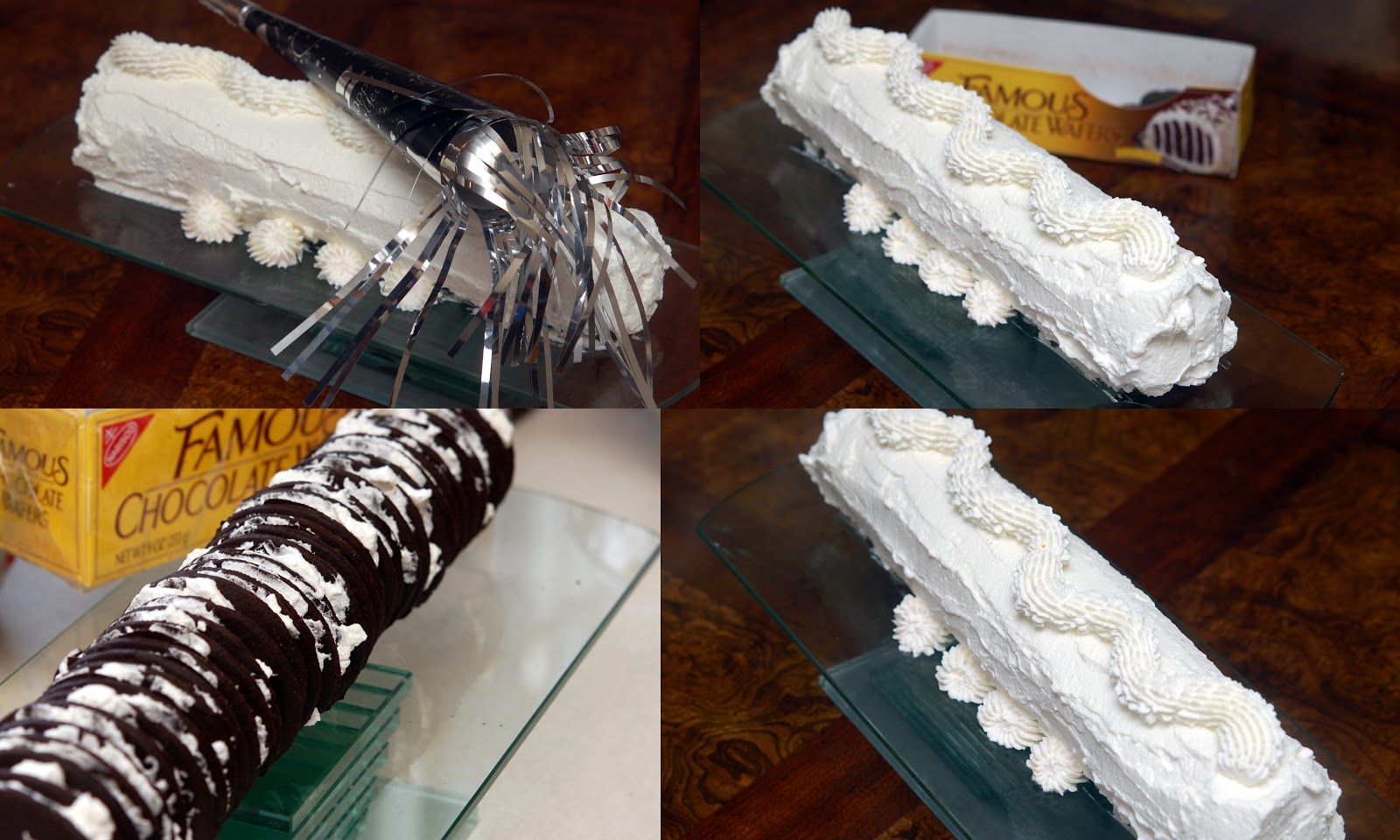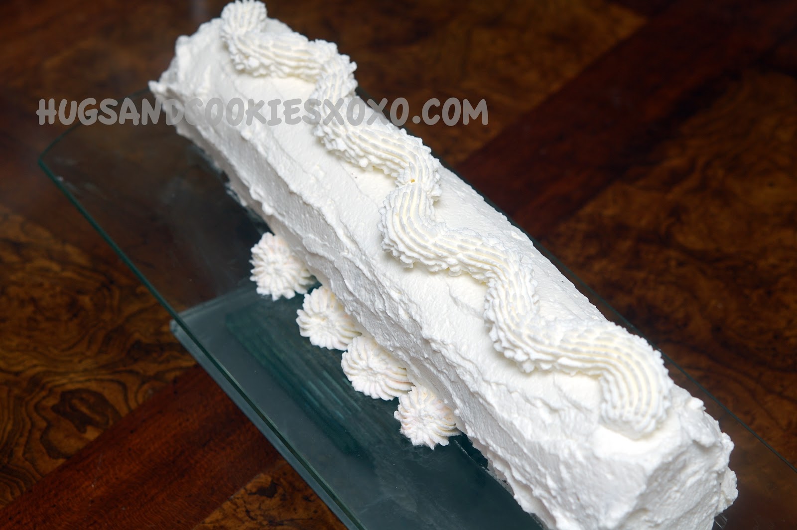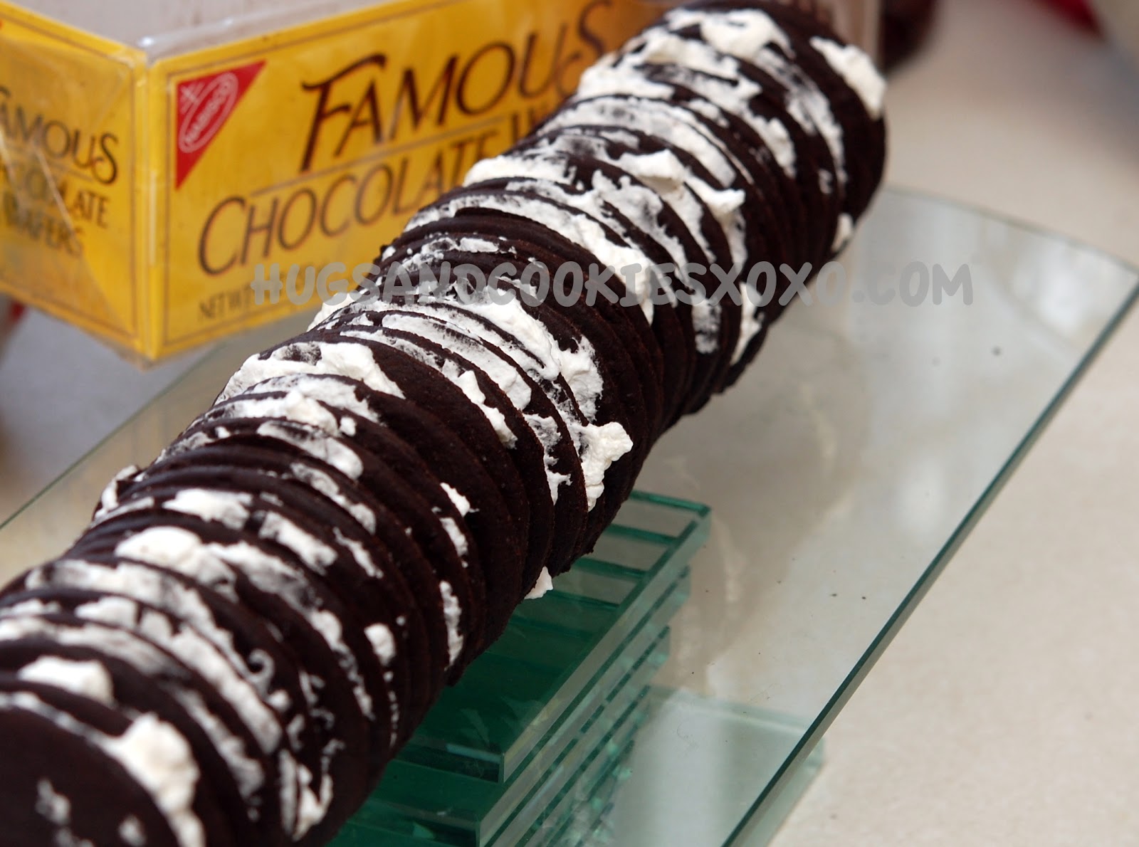 WHIP 2 CUPS OF CREAM AND 1 TSP. VANILLA TO FIRM PEAKS. ADD A LITTLE CREAM IN BETWEEN 2 COOKIES AND KEEP ADDING ON. COVER ENTIRE LOG IN THE EXTRA CREAM AND COVER TO CHILL AT LEAST 3 HOURS OR OVERNIGHT! CUT ON AN ANGLE!