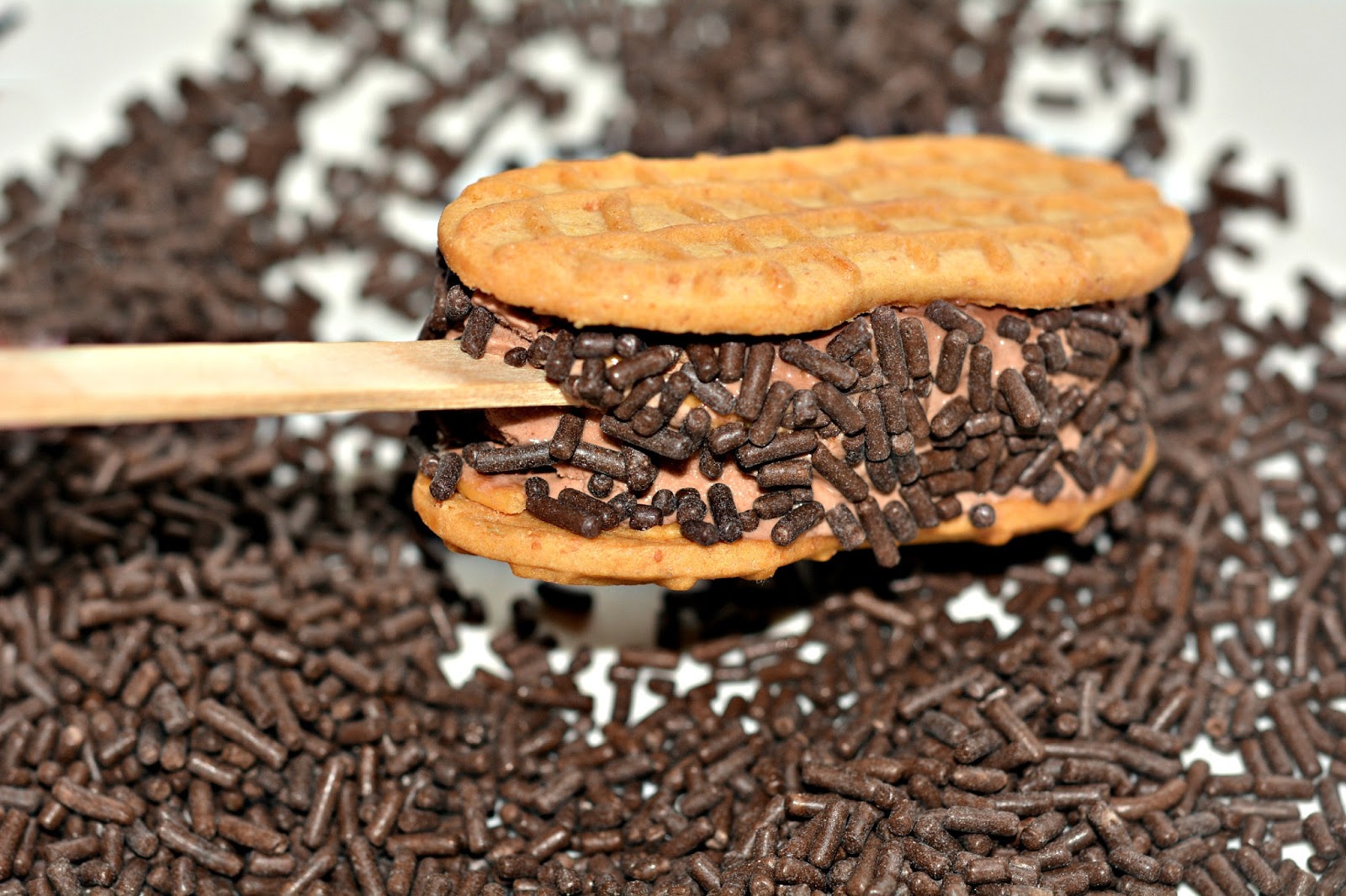 Open the cookie-leave that yummy cream right where it is and pack on some ice cream. Work fast because after all, it is summer you know! That ice cream will melt fast. Once it’s on put the other cookie back on and press a stick in the ice cream. Refrigerate until firm!!!!!