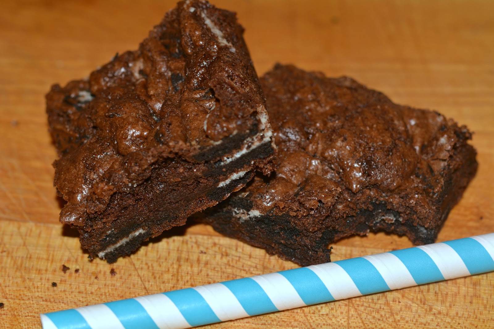 Preheat oven to 350 and line 9″x13″ pan with nonstick foil. In a large bowl, add 4 eggs, and beat with cocoa, salt, baking powder, and vanilla. Stir until fully combined and smooth.In the microwave, melt butter. When melted, add sugar, and stir to combine.Add warm butter/sugar mixture to the egg/cocoa mixture, stiring until smooth. Add the flour to batter and stir until fully incorporated. Stir in Oreos. Spread batter into prepared pan, and smooth as needed.Bake brownies about 30 minutes. Test for doneness by inserting a toothpick. You should find moist crumbs. Cool and cut into small bite sized squares. Adapted from King Arthur Flour