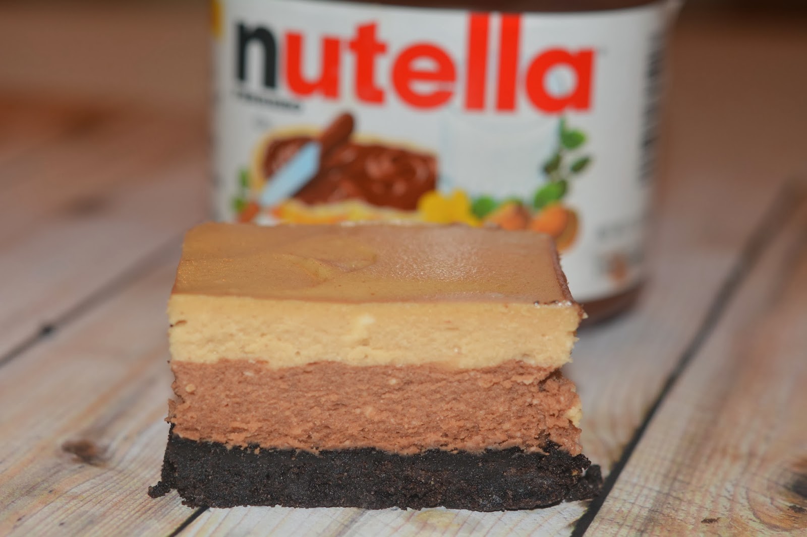 Return the rest of the cream cheese mix to the bowl and add the peanut butter. Spread evenly over the Nutella layer. Bake for about 35 minutes, or until the center jiggles slightly when the pan is gently nudged. Cool completely on a wire rack. Refrigerate for at least 3 hours before cutting into bars.