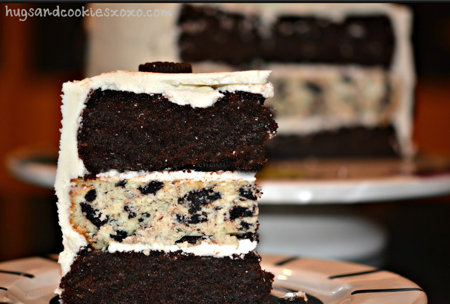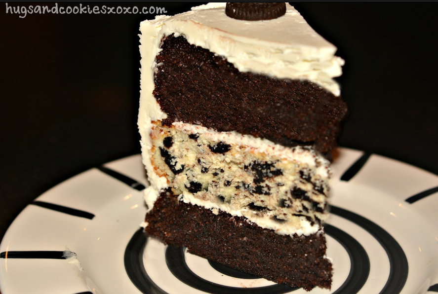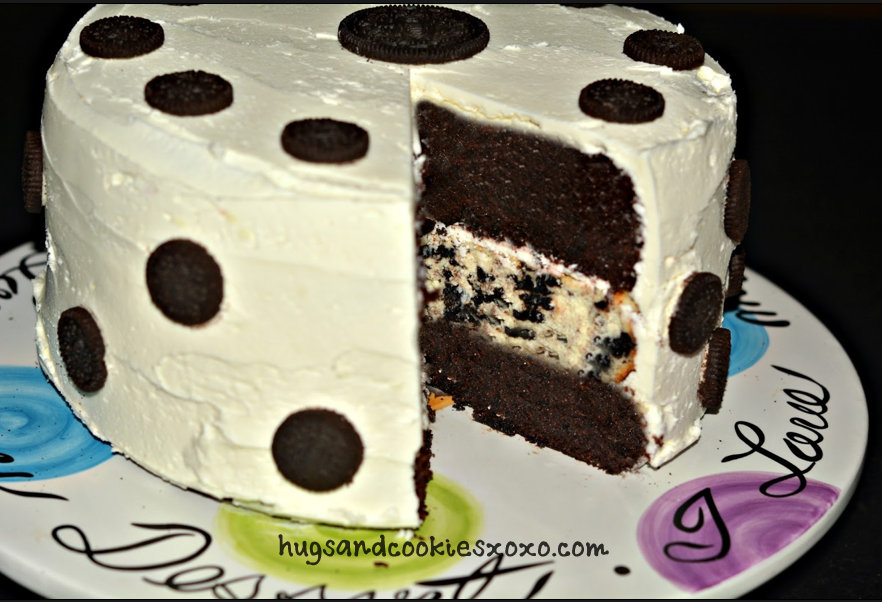 Place one chocolate cake on your cake platter. Spread on a thin layer of frosting and some crushed Oreos. Top with the cheesecake. Thinly frost and add the rest of the crushed Oreos. Add the final chocolate cake layer. Thinly coat the cake with frosting and chill 30 mins as a crumb coat. Frost the cake with the remaining frosting and decorate with mini oreos.