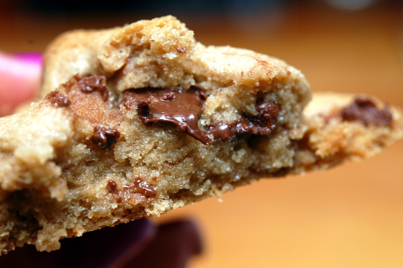 Melt butter in a skillet over medium heat. Whisk constantly until the butter begins to brown. Takes several minutes. Remove heat once brown and smelling nutty and yummy and pour into mixer bowl. Let cool a few minutes. Beat the butter and sugars. Add the egg, yolk, vanilla. Add the dry ingredients. Fold in all of the chocolate chips. Chill dough a few hours or in the freezer 1 hour!