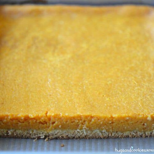 You bake everything together at one time. The crust will be crunchy. This is basically Pumpkin Gooey Butter cake. I’ve been making these for years. But I use some products from Williams-Sonoma. You can use a shortbread mix. Bake it all together, if you don’t to get the middle just right it will burn the shortbread layer.