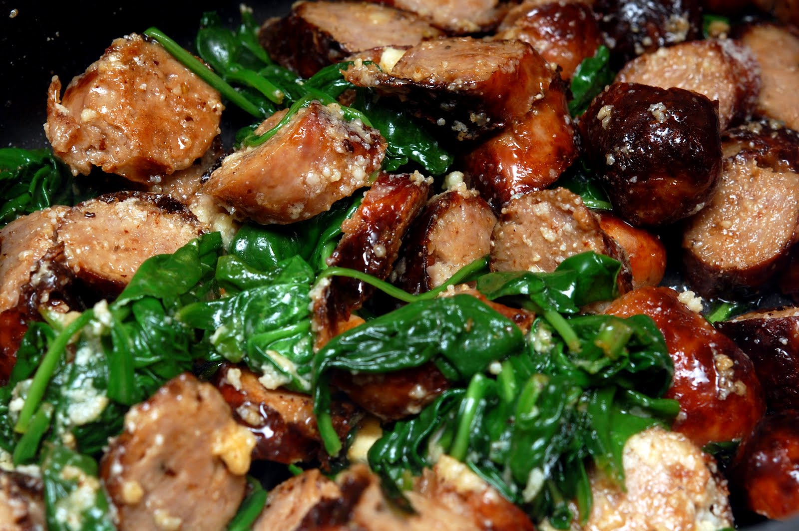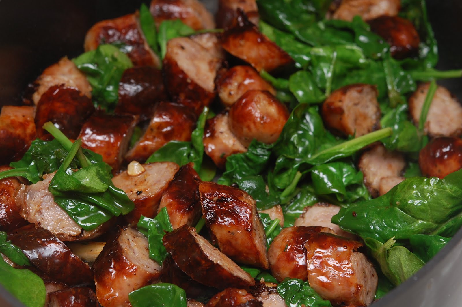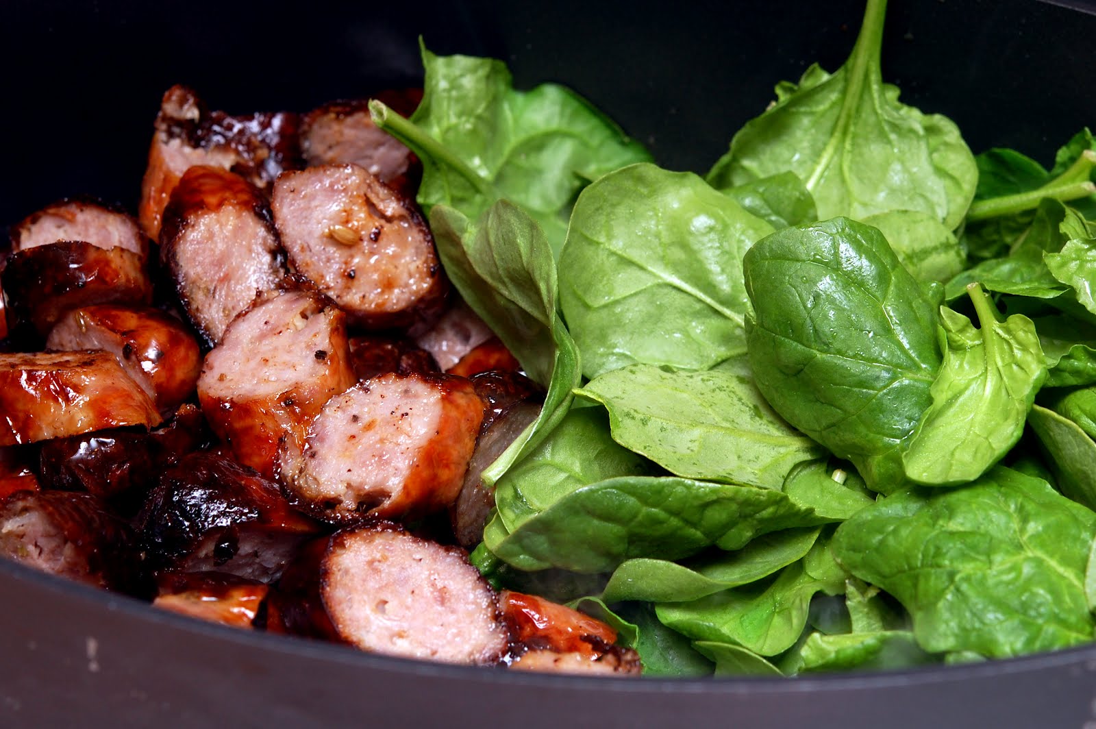 I STARTED BY COOKING 2 PACKAGES OF SAUSAGE LINKS AT 400 UNTIL COMPLETELY BROWNED AND COOKED-45-50 MINS, TURNING ONCE. THEN I SLICED THE SAUSAGE AND THREW THE PIECES INTO A HOT POT WITH SOME EVOO AND ONE PACKAGE OF SPINACH.