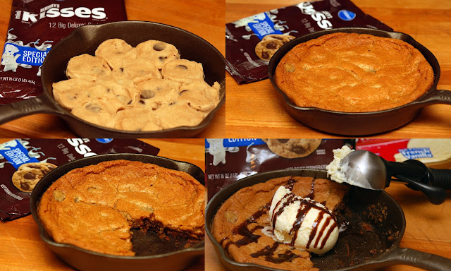 HAVE YOU SEEN THIS NEW COOKIE DOUGH FROM PILLSBURY? HERSHEY KISSES IN THE DOUGH…WHO COULD RESIST!? LINE THE BOTTOM OF AN 8 INCH CAST IRON SKILLET WITH THE COOKIES AND BAKE AT 350 FOR ABOUT 40 MINUTES UNTIL IT IS GOLDEN AND COOKED THROUGH. SERVE WITH ICE CREAM AND HOT FUDGE….OF COURSE!