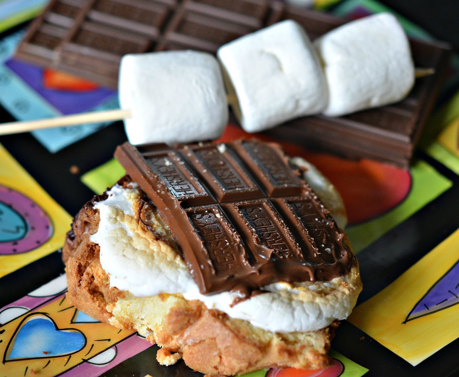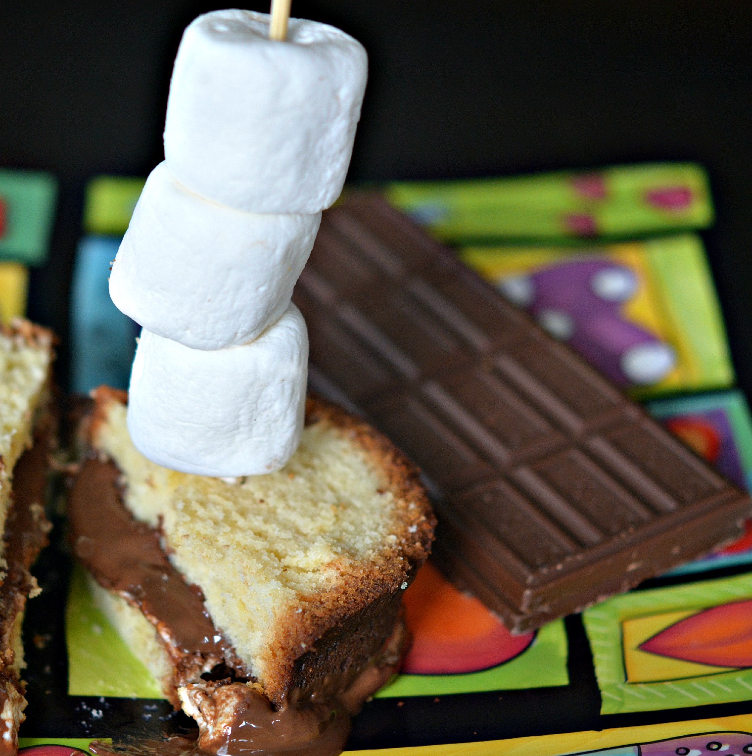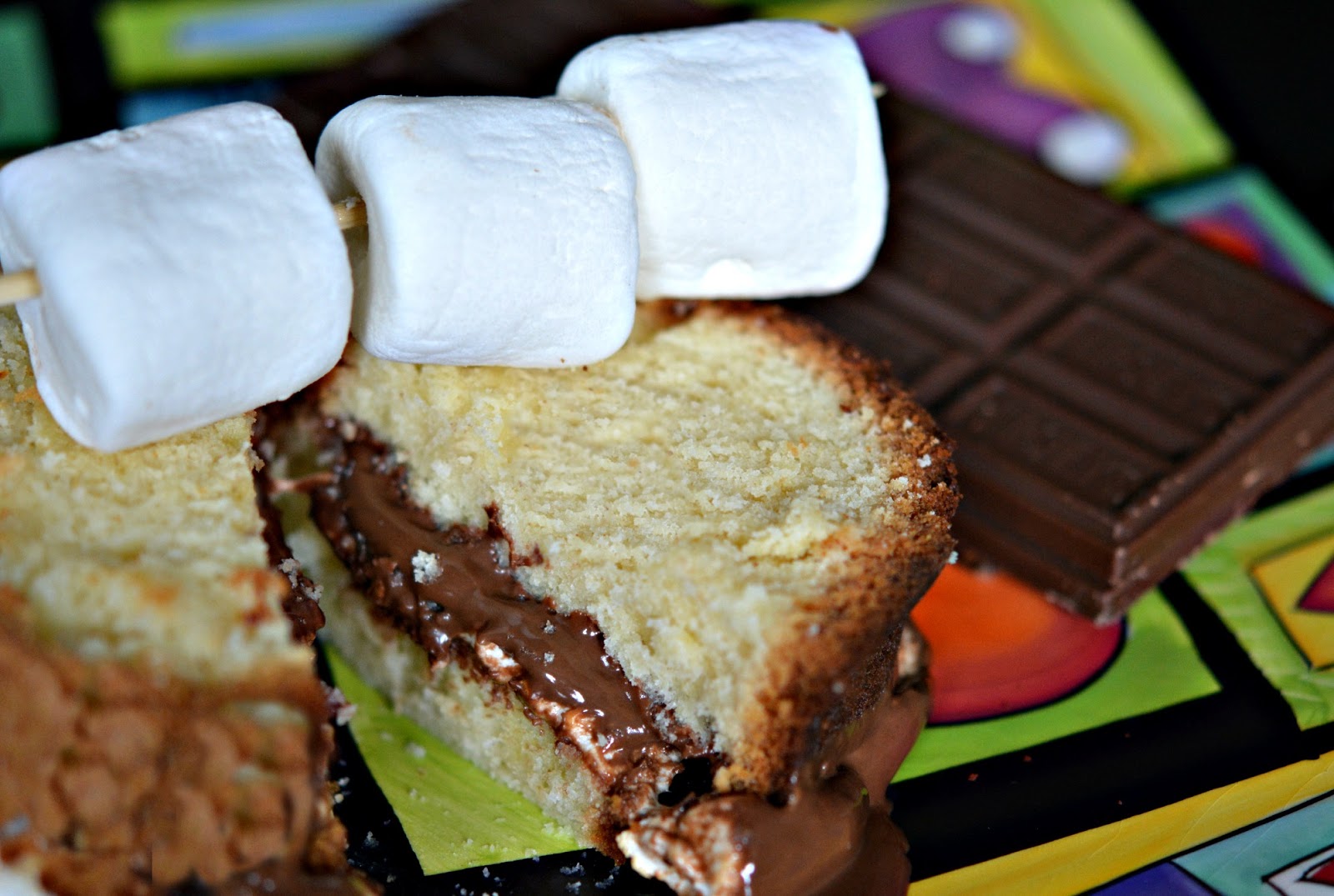 After the cake is totally cooled or a day old you will cut fairly thick slices. For each serving cut 2 slices and lay on a nonstick foil lined pan. On one slice place 3 marshmallow halves. The other slice stays plain. Broil both slices just until the marshmallows are nicely toasted. Remove and immediately lay on half a Hershey bar that was room temp. (Cold chocolate won’t melt as well.) Top with the other slice and dig in!