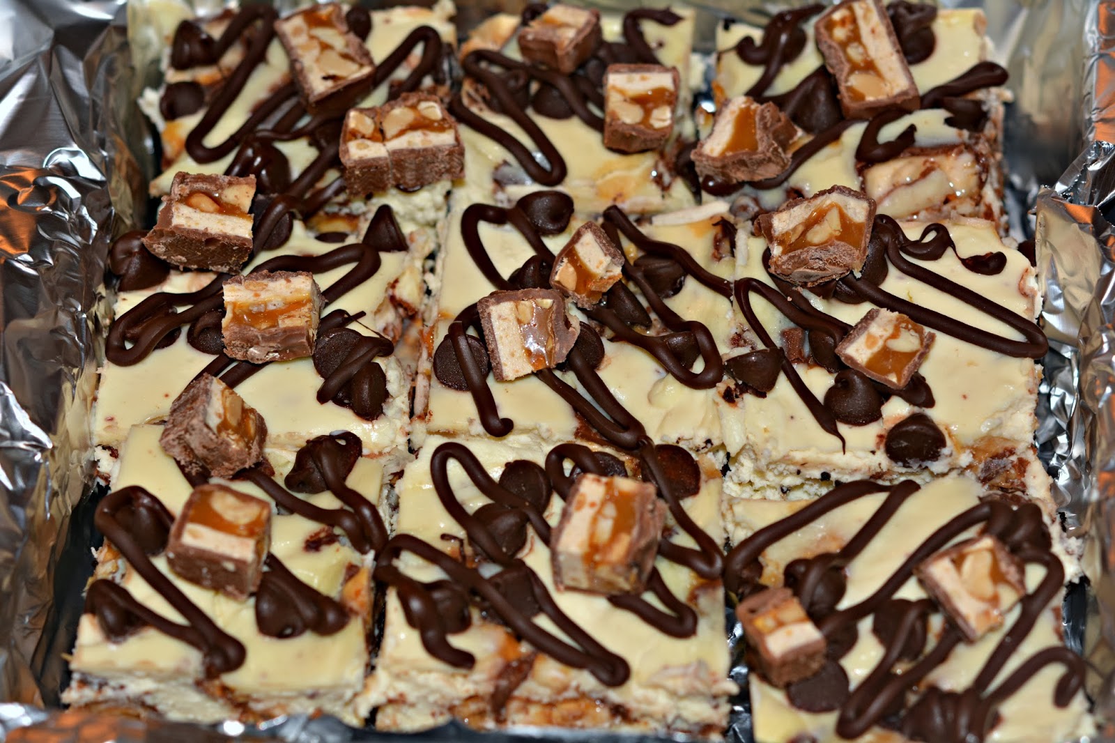For the filling: Beat cream cheese, egg, sugar, and vanilla extract until creamy, about 3 minutes. Fold in the Snickers and spread the mixture over the cooled crust. Top with chocolate chips. Bake for 30-35 minutes, or until the cheesecake has set up and the edges are lightly browned. Cool for 30 minutes and then chill in fridge at least 3 hours. Cut into squares and drizzle with melted chocolate chips, if desired.