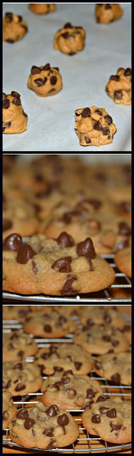 Melt butter in microwave. Stir sugar in by hand until combined. Add eggs and vanilla. Pour in dry ingredients and stir to combine. Fold in chips. Chill until cold-I sped this step up by placing the dough in the freezer! Scoop out your cookies. I weighed each cookie to be 1 1/4 ounces. Add a few chips to fancy up the top and bake at 350° on parchment lined sheets for 11-13 mins. Cool a few mins on sheets and remove to cooling rack.