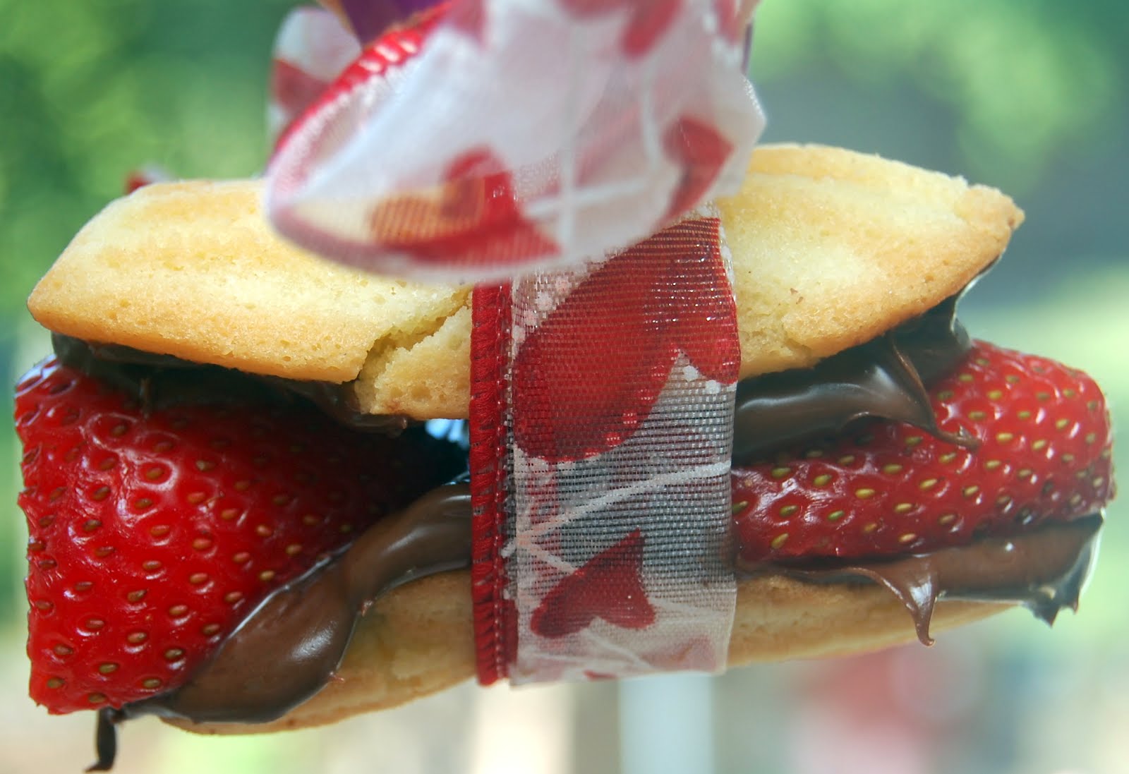 OF COURSE WE NEEDED A GROWN-UP TREAT!!! HERE ARE 2 MADELEINES STUFFED WITH NUTELLA AND STRAWBERRIES!!! LOVE THE BOW! THANKS FOR THAT RIBBON IDEA, DONSUEMOR!!!