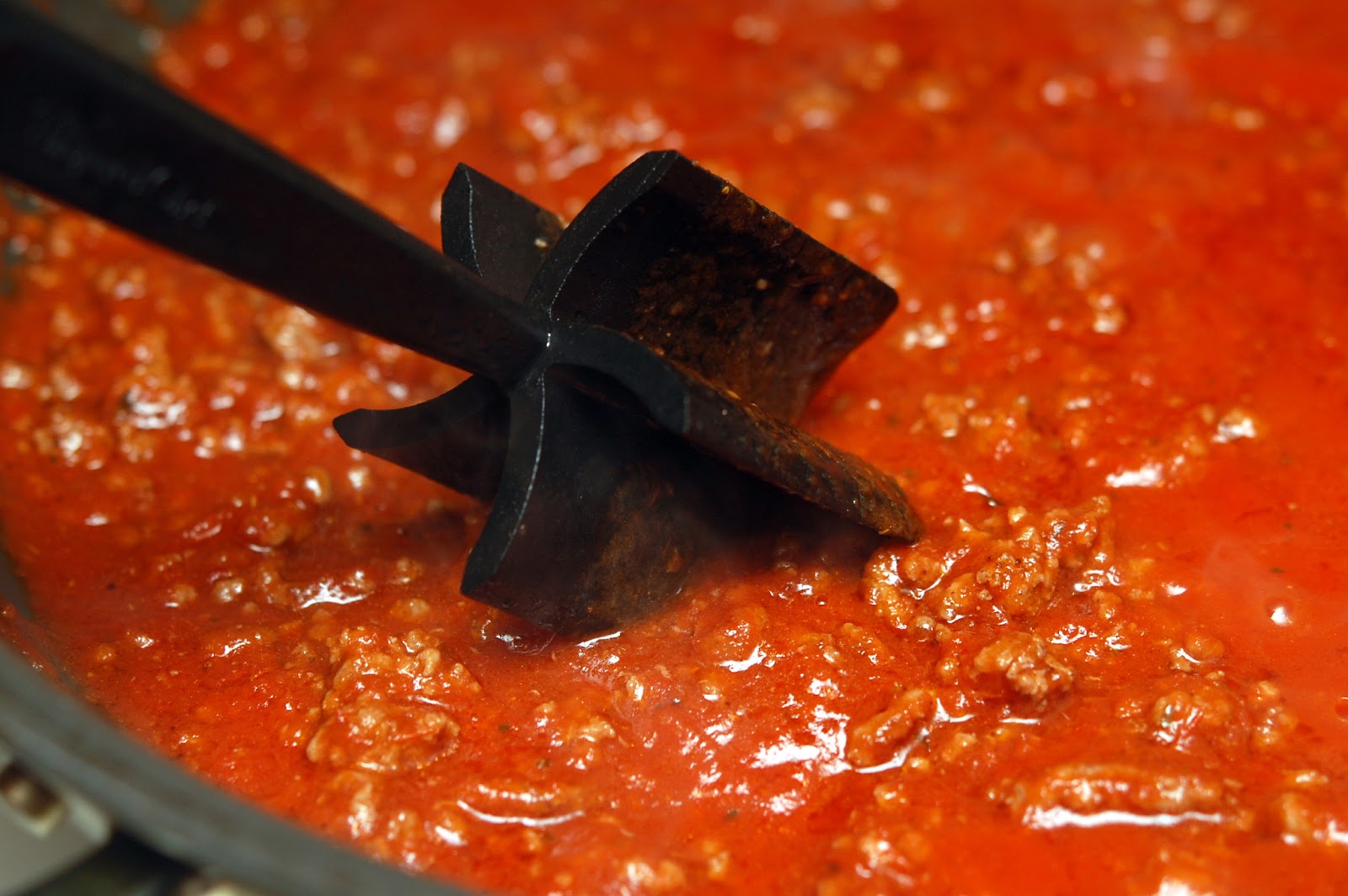 COOK 1 OR 1 1/2 POUNDS GROUND BEEF IN A SKILLET BREAKING IT UP AS YOU GO! HERE YOU CAN SEE MY AWESOME PAMPERED CHEF TOOL TO DO THE BREAKING UP! (HOSTING A PARTY IN MARCH IF YOU WANT TO SNAG ONE LOL)