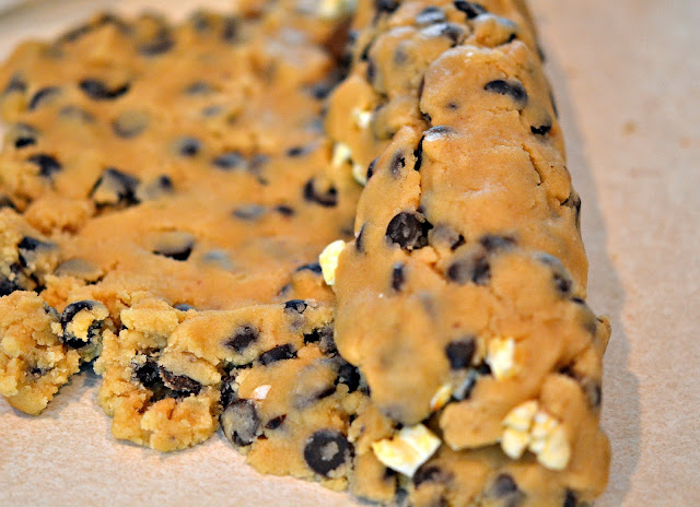 | Flatten your cookie dough and add some popcorn and Milk Duds! |