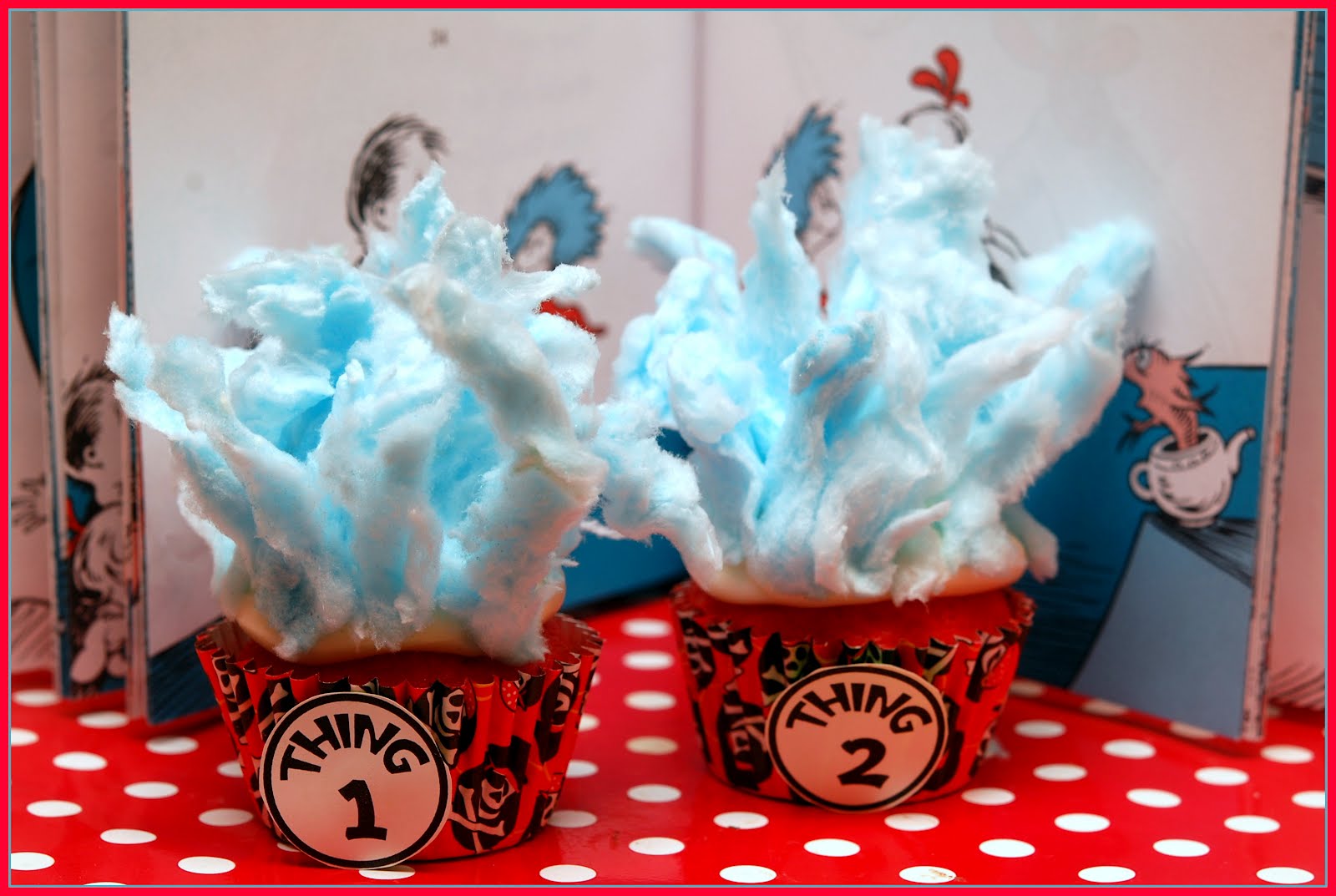 Make your favorite cupcakes and frost. Add blue cotton candy for hair and serve immediately…or the cotton candy will start to dissolve. Attach thing 1 and thing 2 signs for decoration. Serve up with your favorite Dr. Seuss book…like Cat in the Hat!
