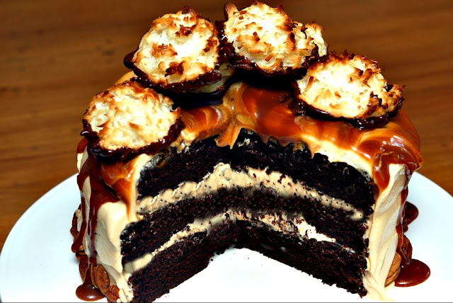 Assembly-cake, buttercream, cake, buttercream, cake and coat whole cake with buttercream. Pour some caramel on top (i chilled it first to thicken it) and let it drip down the sides. Chill and then top with your macaroons! Line bottom of cake with pecans!